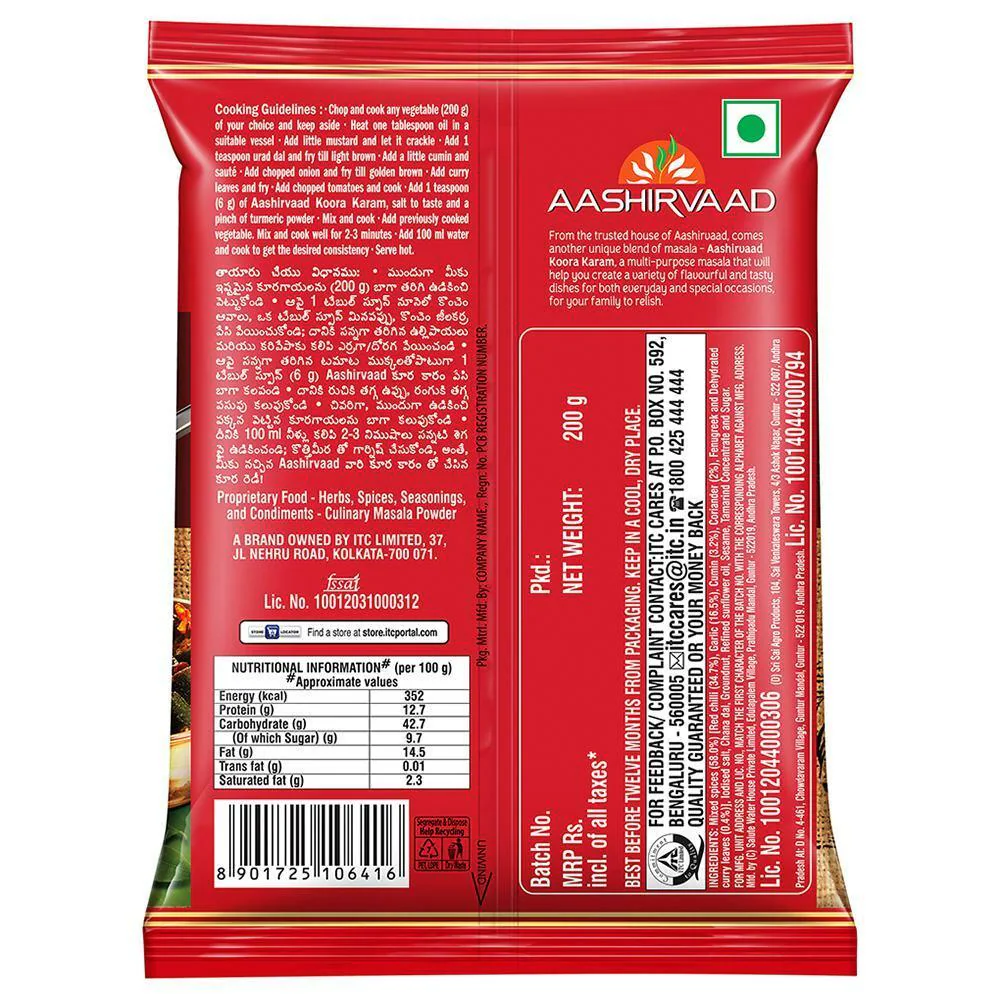 From the trusted house of Aashirvaad, comes another unique blend of masala - Koora Karam, a multi-purpose masala that will help you create a variety of flavourful and tasty dishes for both, everyday and special occasions, for your family to relish.