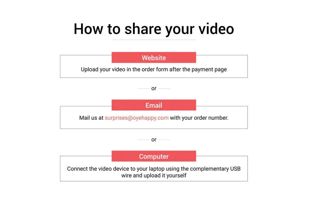 You can share your video with us in the order form after the payment page. We can also create a slideshow using photos and messages for just Re.1