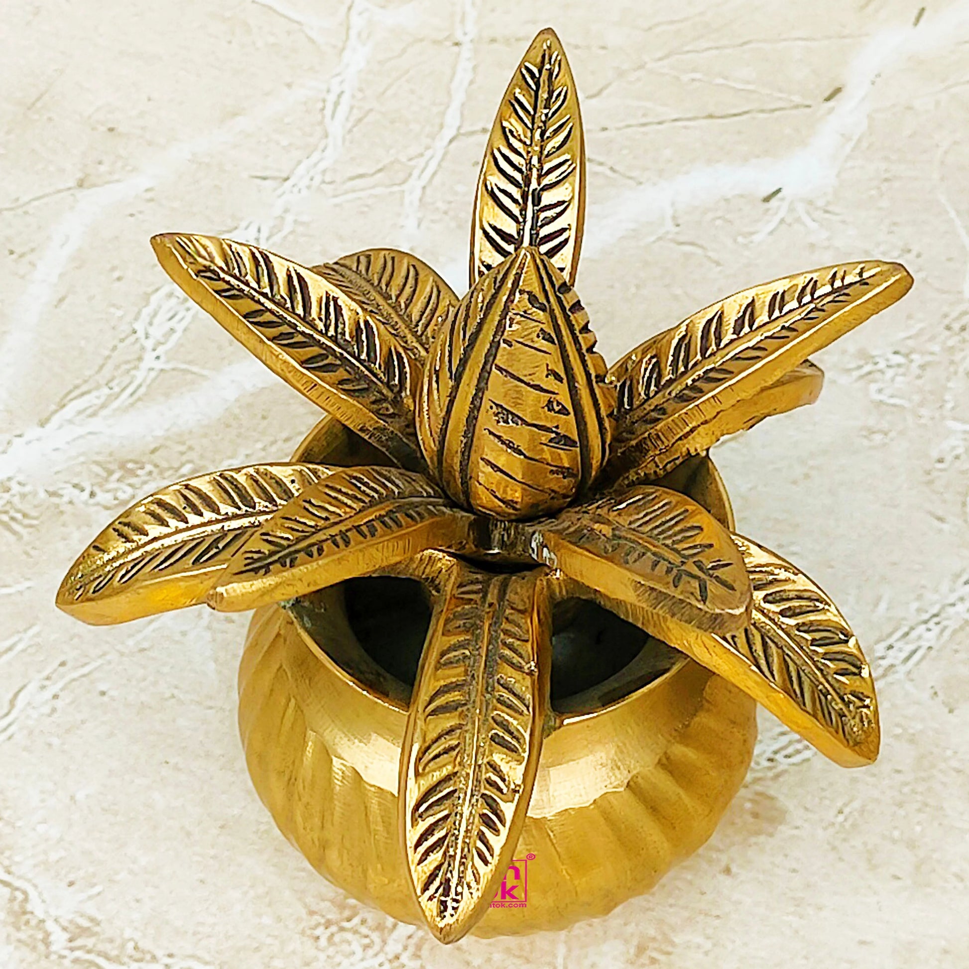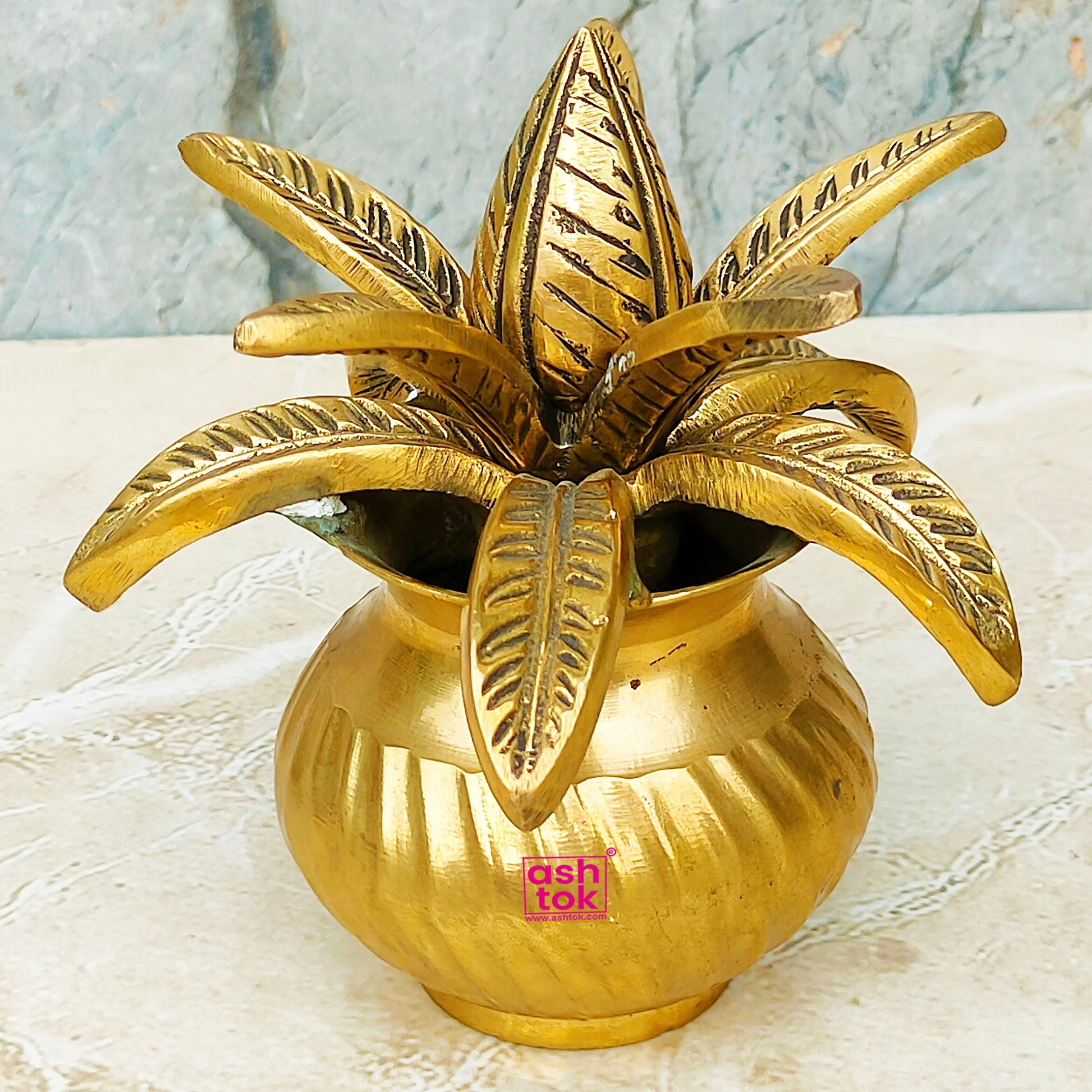 Antic Brass Coconut Design Kalash with Leafs, Kalash for Puja, Brass Puja Decorative Item