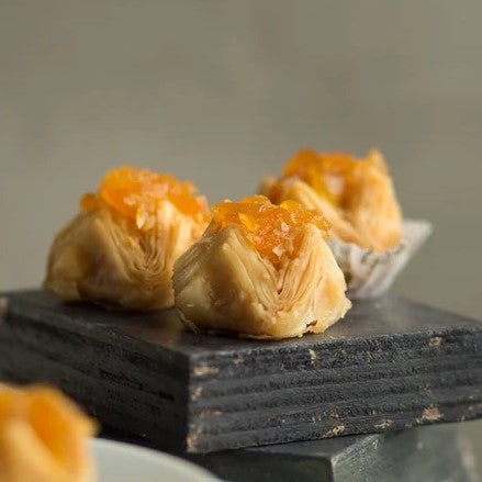 Our Apricot Pyramid baklava layers juicy apricot pieces within crisp, buttery filo pastry, creating a sweet, sculptural delight.