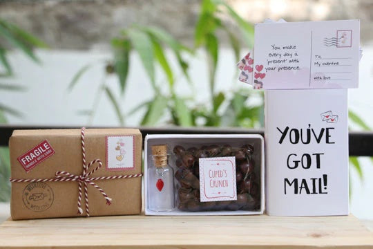 A quirky and romantic gift box with extremely unique goodies approved by Cupid himself! The you’ve got mail box includes a tiny heart in a bottle, a packet of Cupid’s Crunch chocolates and 5 miniature postcards with the following messages: