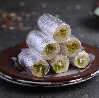 Badam Pista Roll is a rich and luxurious Indian sweet made with finely ground almonds and pistachios, blended with sugar and ghee.