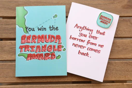 - Gift that careless person in your life an award for never returning anything they borrow. The card is complemented with a 'Bermuda Triangle Award' badge.