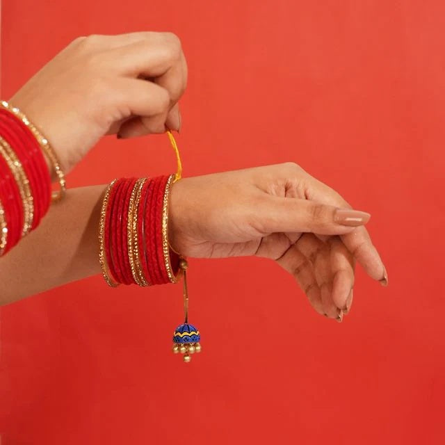 The beautifully designed gift box contains one Rakhi for Brother, one Lumba Rakhi for Bhabhi, and an extra jhumka to turn the Lumba Rakhi into a pair of earrings.