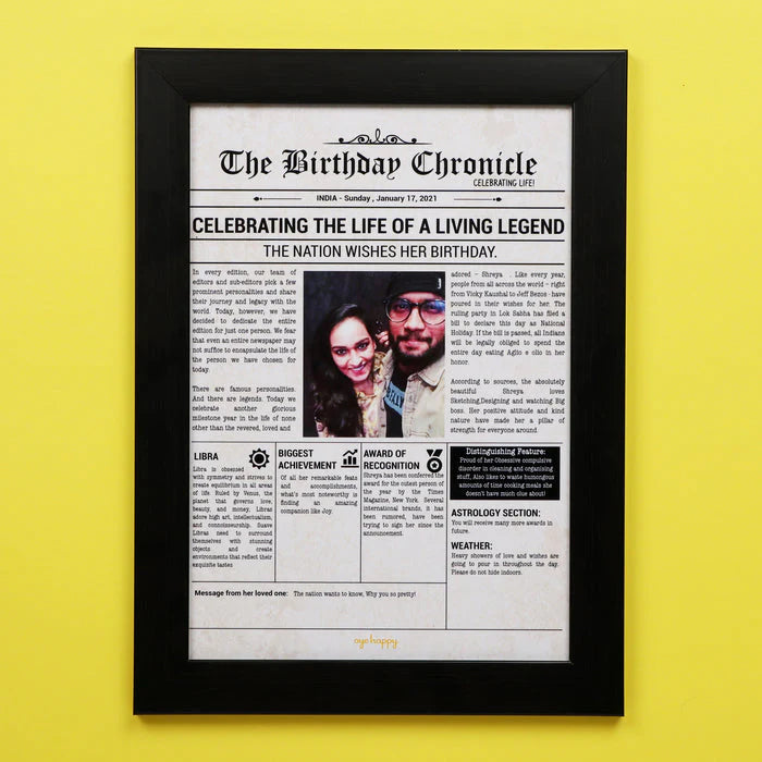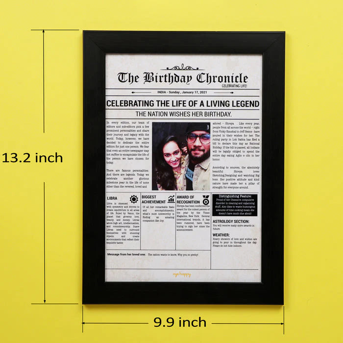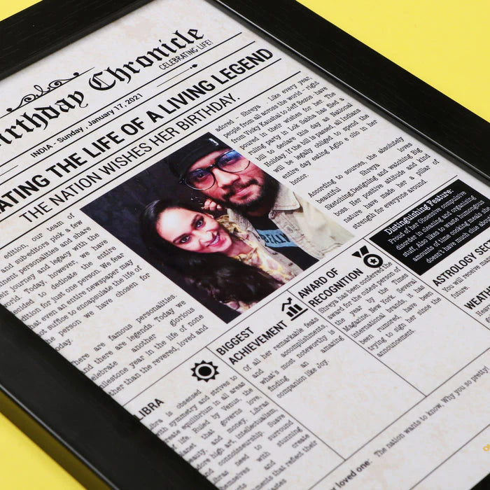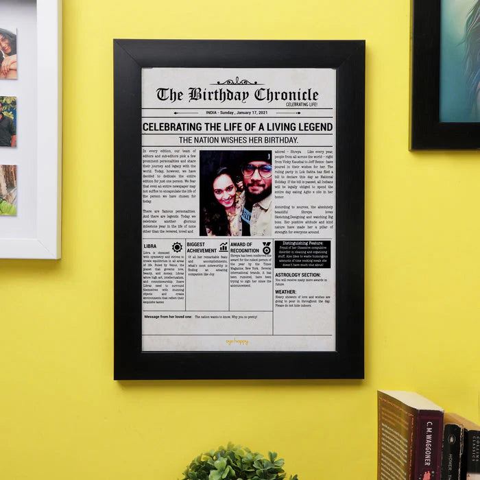 The newspaper article will be framed in a classy wooden frame so that your loved one can place it on the favorite corner of his/her home. Based on the nature, likes, and interests of the person, the article can be themed around the special one.