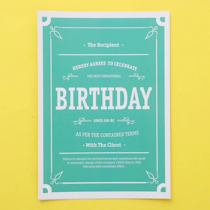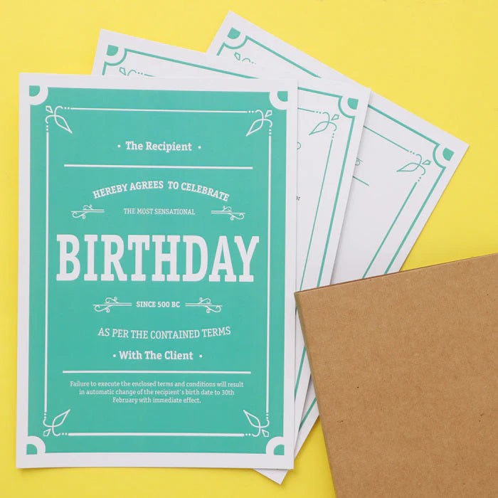 Send that Birthday crazy person a formally packaged envelope comprising a hilarious contract binding him/her into celebrating the most sensational Birthday since 5000 BC.