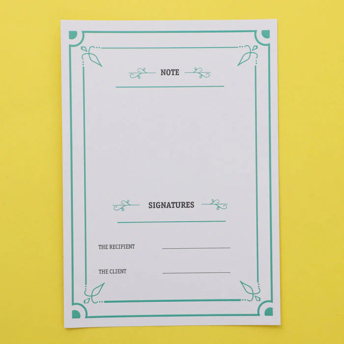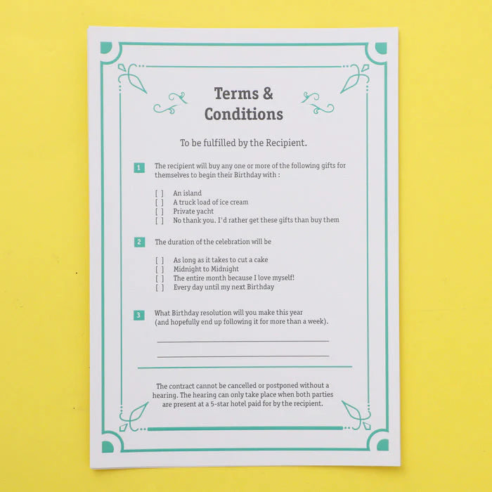 Within each contract, you will find a list of funny terms to be fulfilled by the recipient. Failure to complete the contract card under the hereto terms and agreements set forth by the court of Oye Happy will result in some pretty dire consequences.