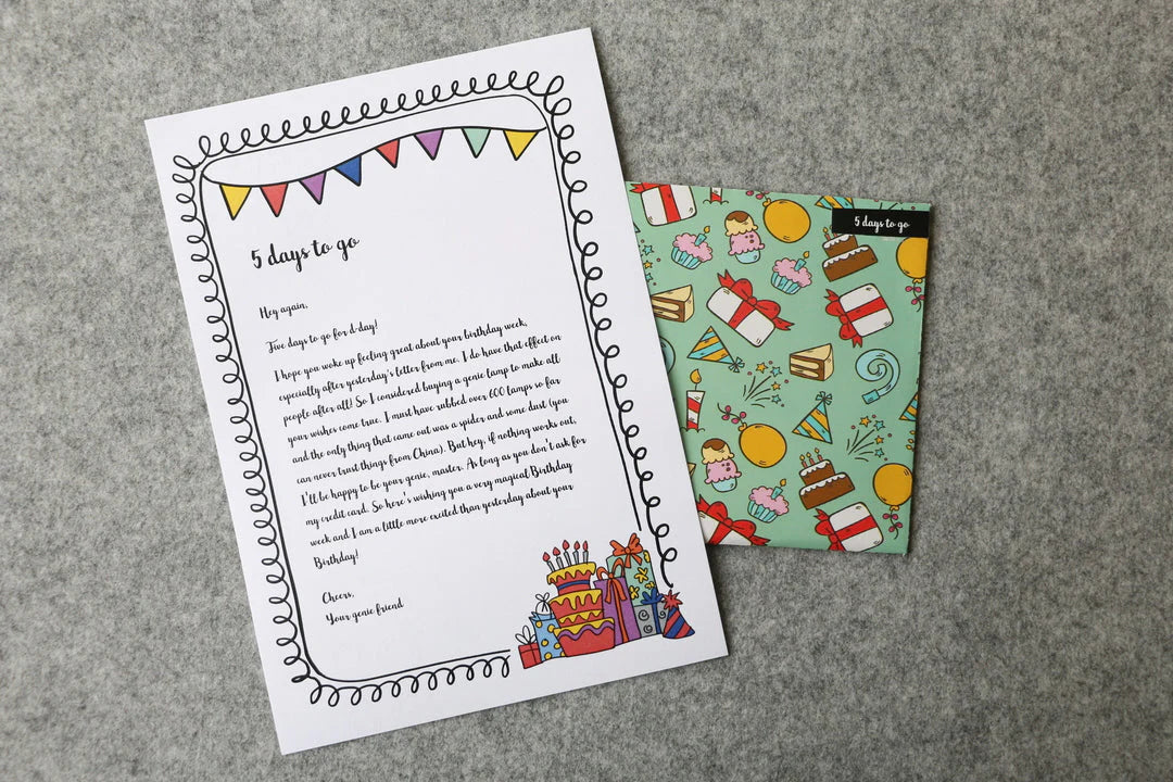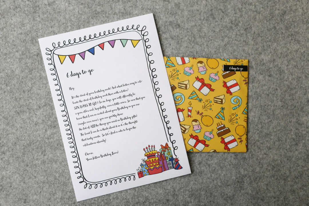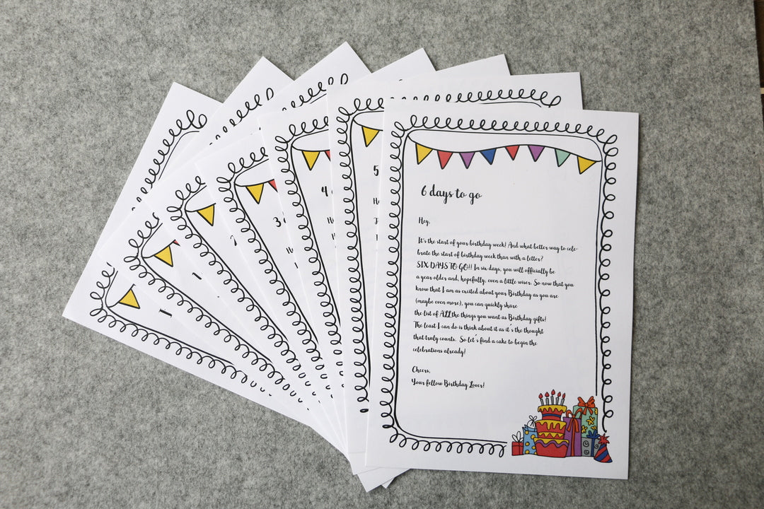 Each letter is numbered so that they can open the first letter 6 days before their Birthday, the second letter 5 days before and so on. You can choose to have the entire bunch sent to the special one or hand one letter yourself each day!