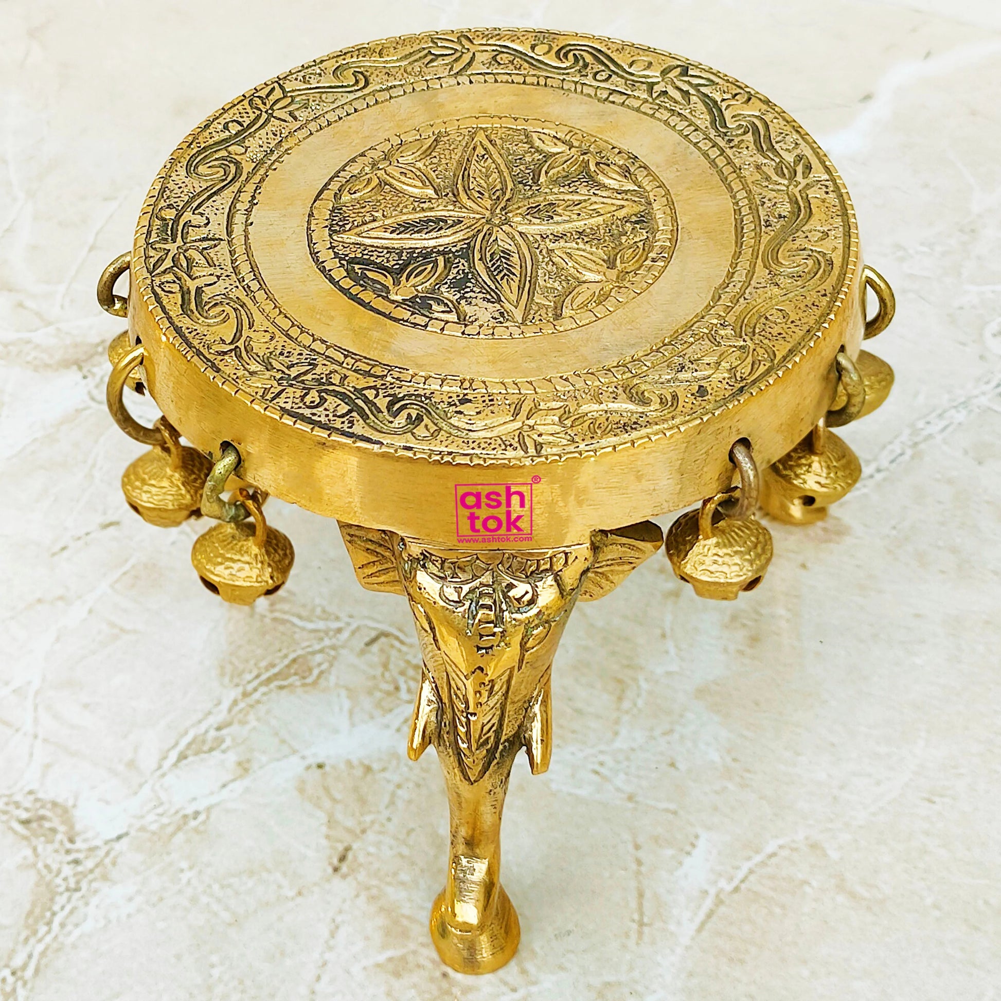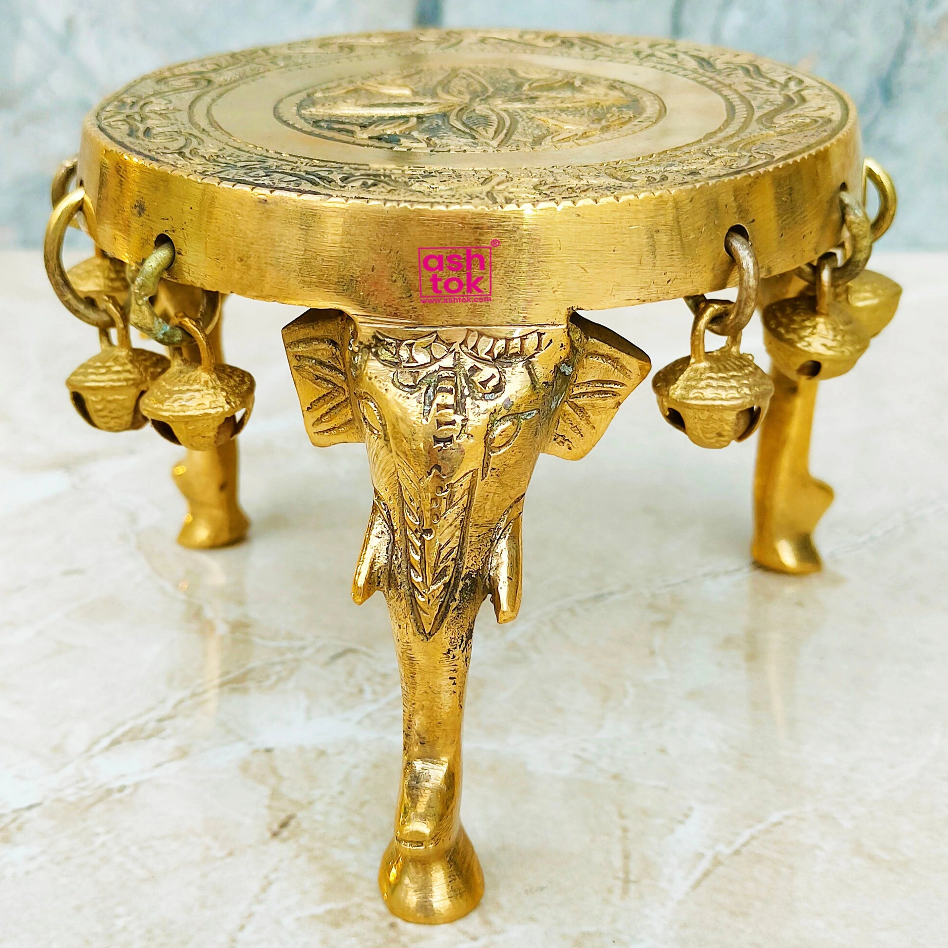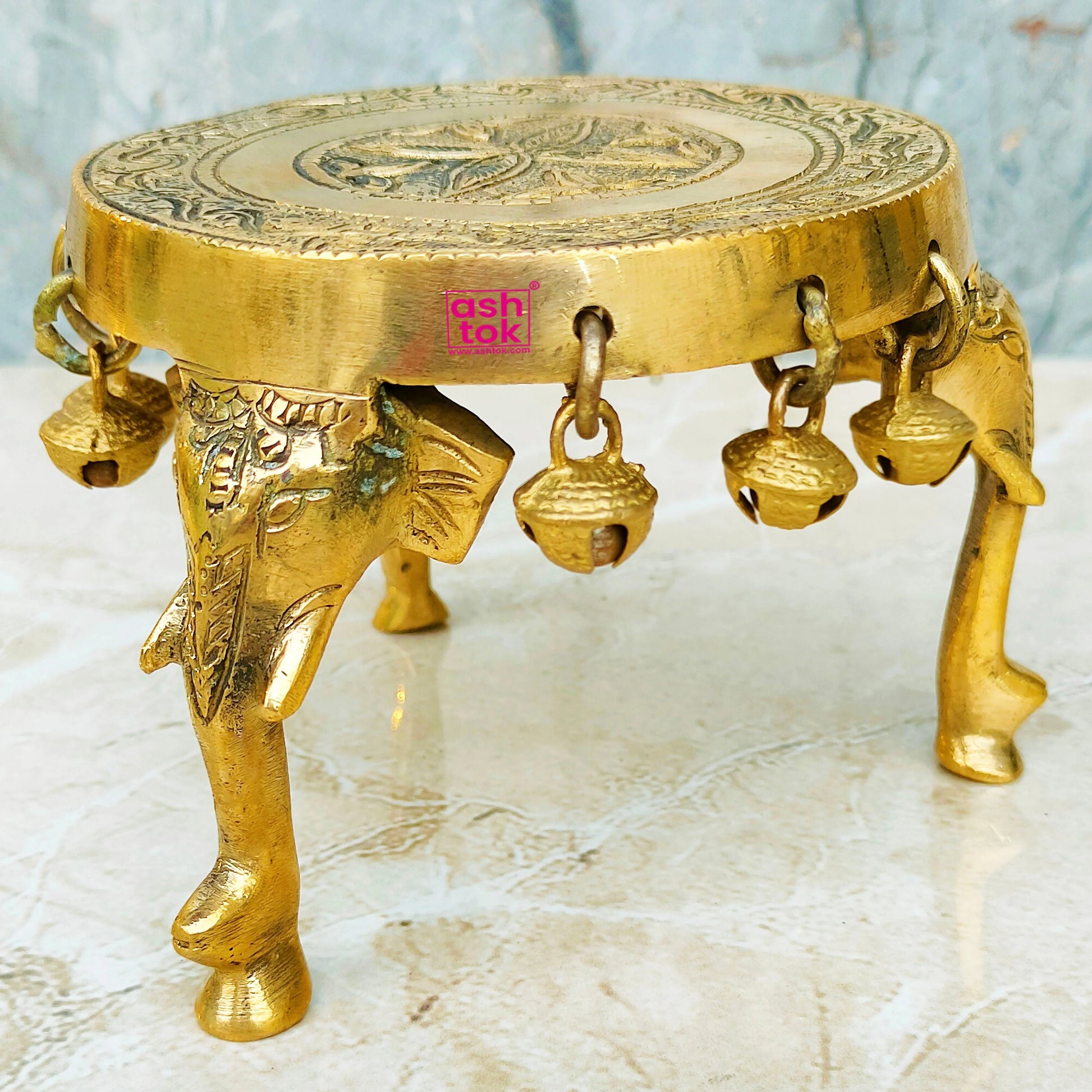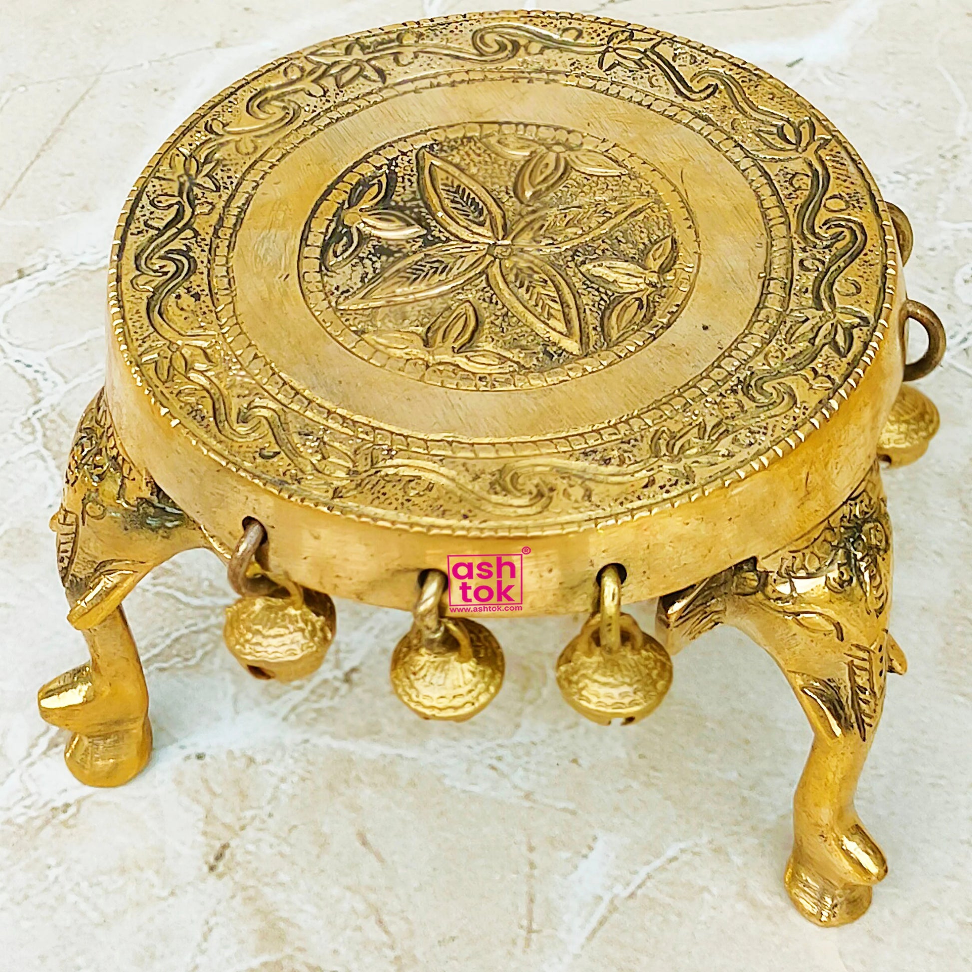 Brass Antique Urli Stand, Elephant Pillar Design Leg, Pooja Brass Chowki - Uruli Stand with Bells