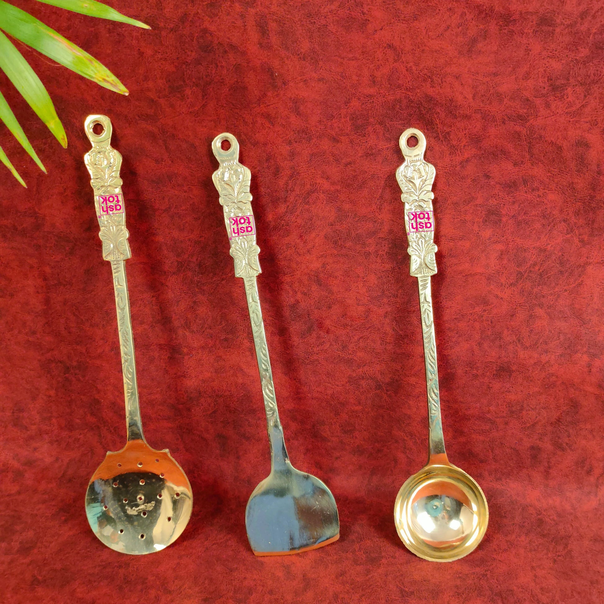 Ashtok Premium Set of 3 Cooking Spoons made of Brass. We don't realize how our life would be without having spoons invented. They are an integral part of our lives. Be it eating or cooking or serving, we need spoons in our daily lives, and we cannot imagine life without them.