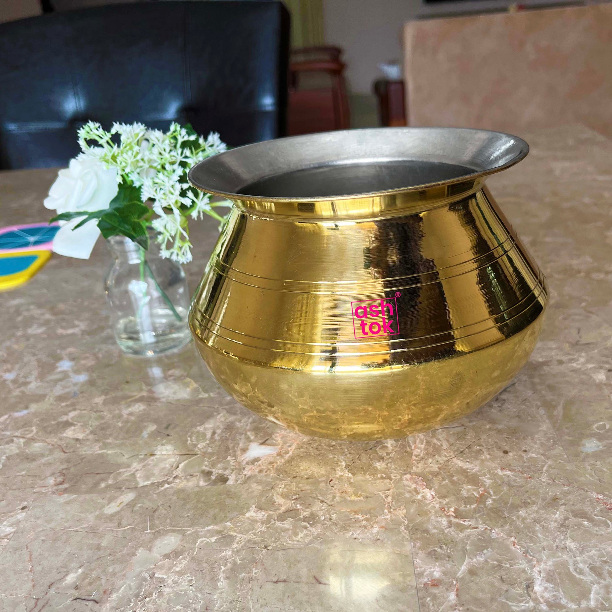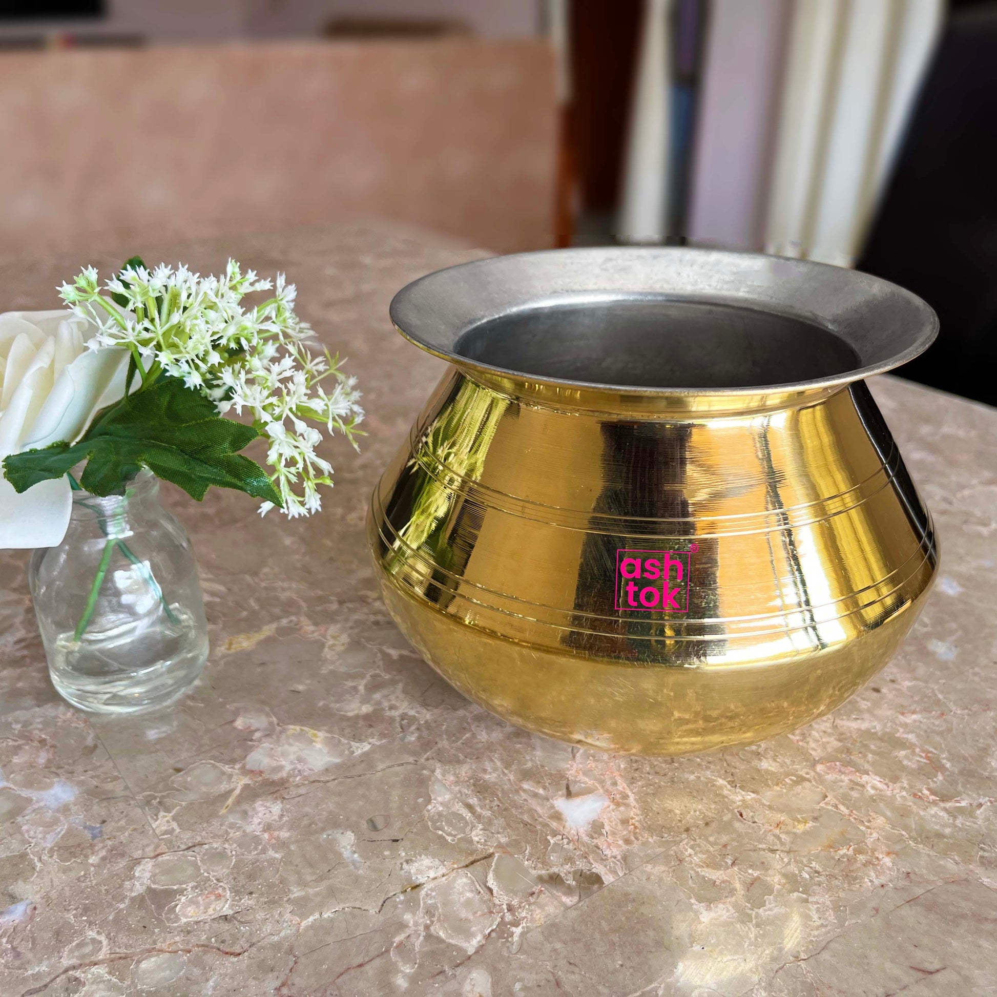 Product Details: Brass Dekchi, a cooking pot with a tin coating (Kalai) inside. Indian Brass Cooking Pot. It is an elegant Pot that may be used to hold water or as cookware. It is made of a thick brass sheet that can endure high heat and adds flavor to the food. Brass is a metal alloy composed of copper and zinc. It is a sign of pride, riches, and beauty. It has long been utilized in the manufacture of kitchenware. Brass, unlike iron, is rustproof, safe, environmentally benign, and recyclable. Brass has a longer lifespan than other metals or alloys and requires no maintenance.