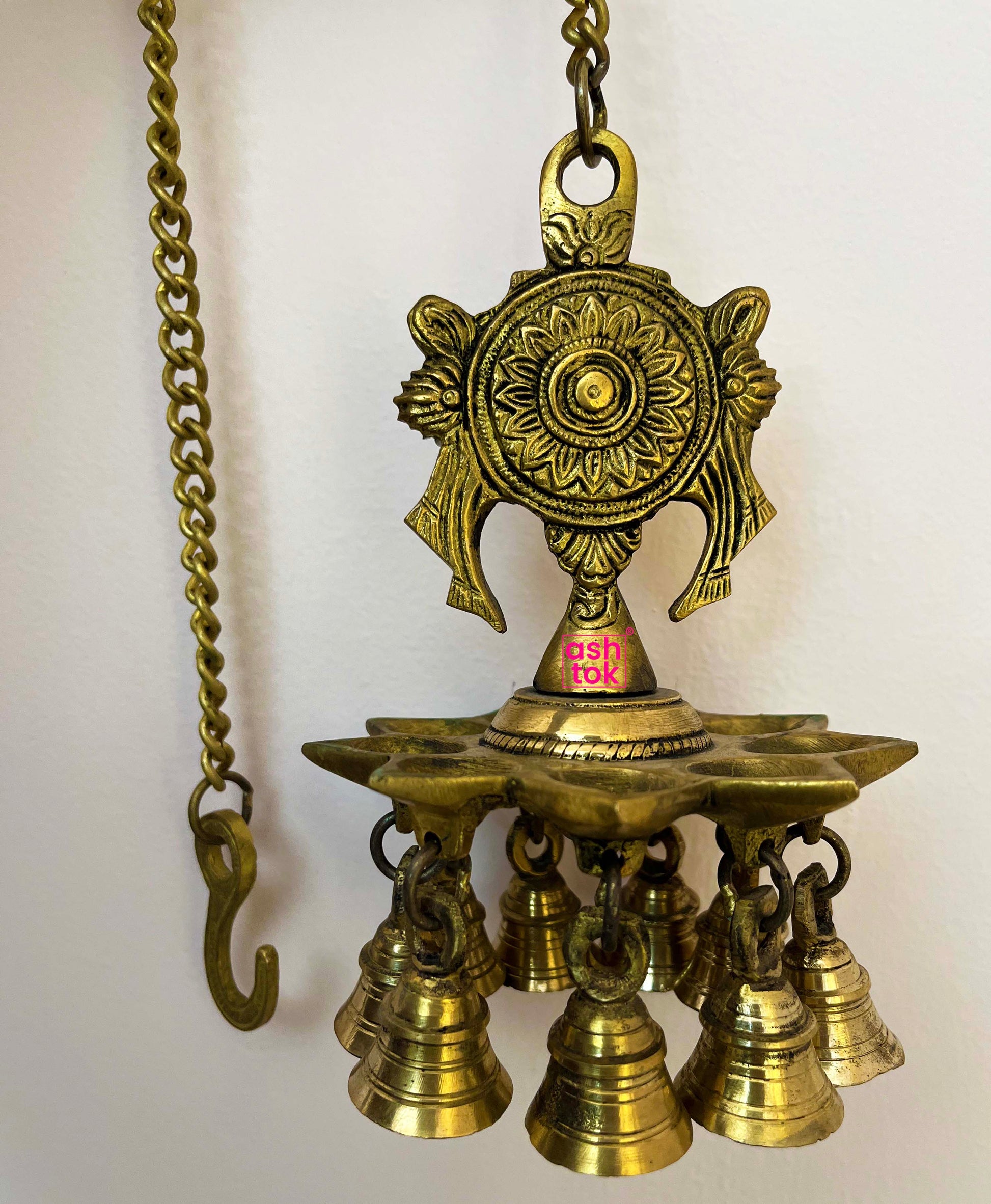 Product Details: Beautifully carved brass diya with Shankh and Chakra. Diya symbolizes, goodness, prosperity, and power. Bring home this beautiful Brass Diya to use in your pooja room or to decorate your home with to add a sense of beauty! This item is made of Brass. Brass oil lamp with Chakra Symbol This is one of Lord Vishnu's divine symbols that symbolizes the Cycle of Time. Pure Brass Hanging Diya with Antique Finish Brass Oil Lamp with the Shanku Chakra (Sea Shell) symbol The whole item is made of Pure Brass and includes nine oil lights, 9 hanging bells linked to the oil lamps, and one brass chain with a hook to hang the diya. Brass oil lamps are traditionally used to signify cleanliness, blessings, and divinity. When hanging on the roof, this brass diya will illuminate and adorn your house, pooja room, or temple. This beautiful hanging diya is used for puja in many devout Hindu families. To complement the diya, artisans added bells below each face and a Chakra pattern on top, making it one of the most devout and auspicious additions to any modern home.