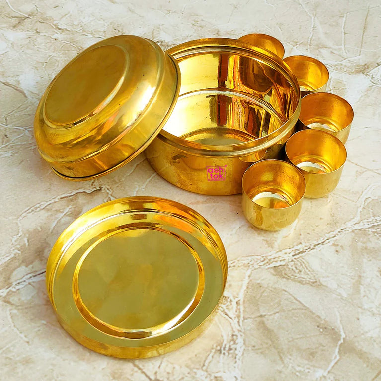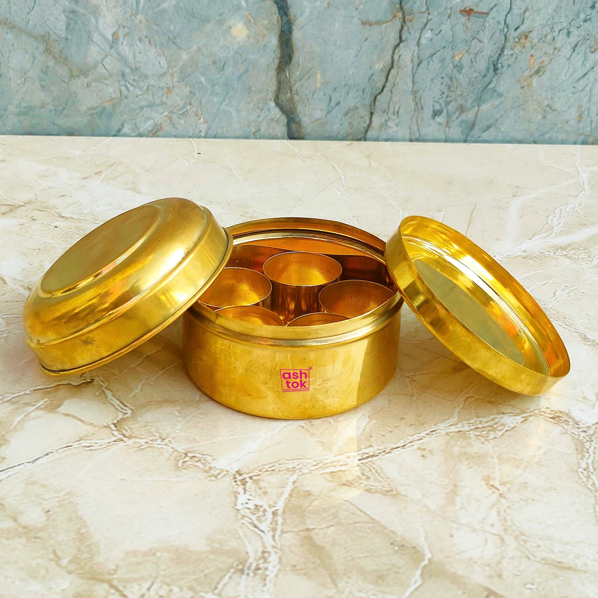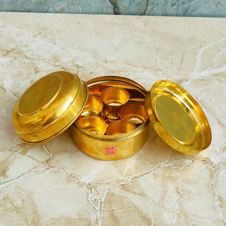 Elevate your kitchen decor with our exquisite Brass Masala Box, crafted to perfection by skilled artisans. This traditional yet stylish box is designed to store your spices in a convenient and elegant manner. Each compartment is intricately designed to keep your spices fresh and easily accessible. Made from high-quality brass, this masala box is not only durable but also adds a touch of luxury to your kitchen.