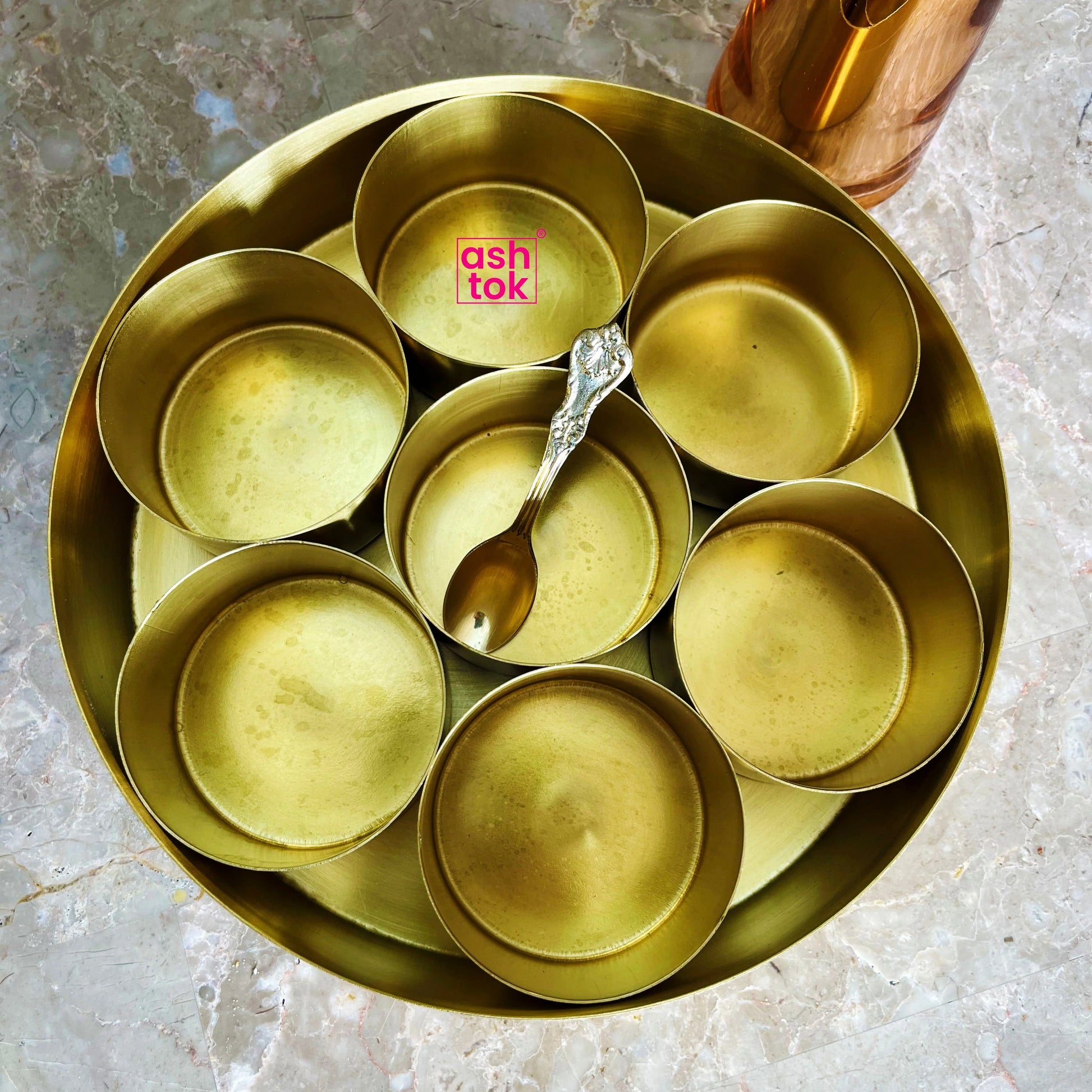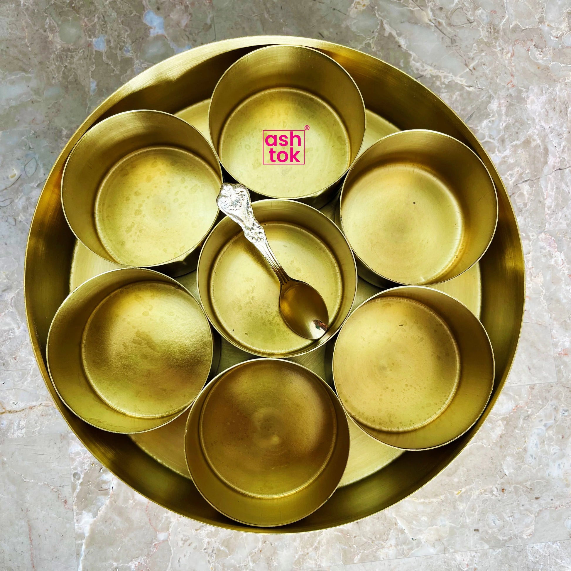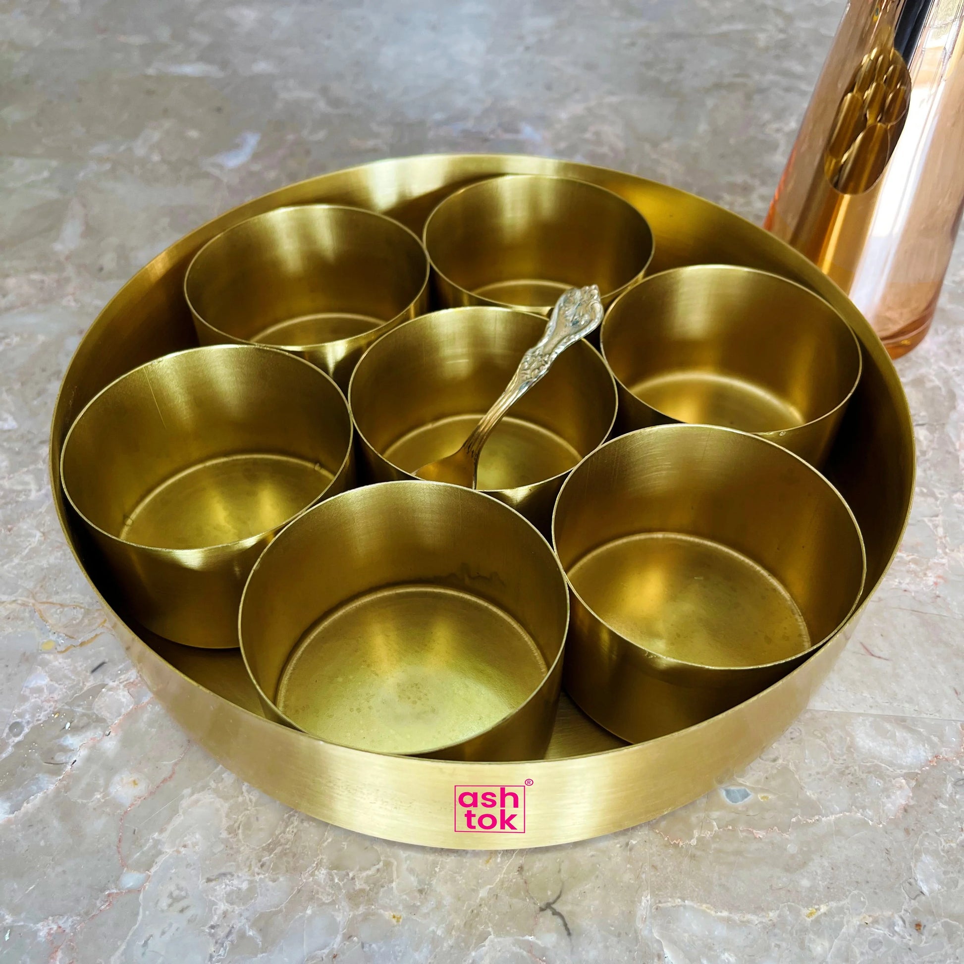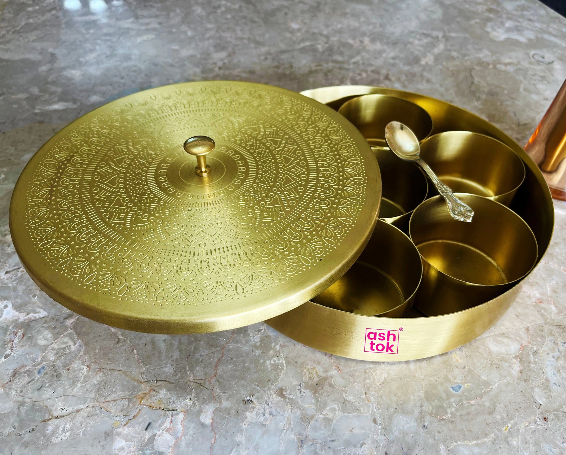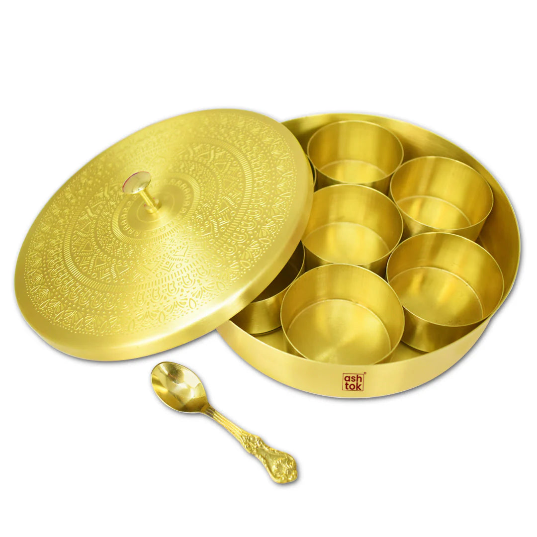 Package Contains: 1 Brass Masala Box Set with 7 Cups, Spoon, and Lid.