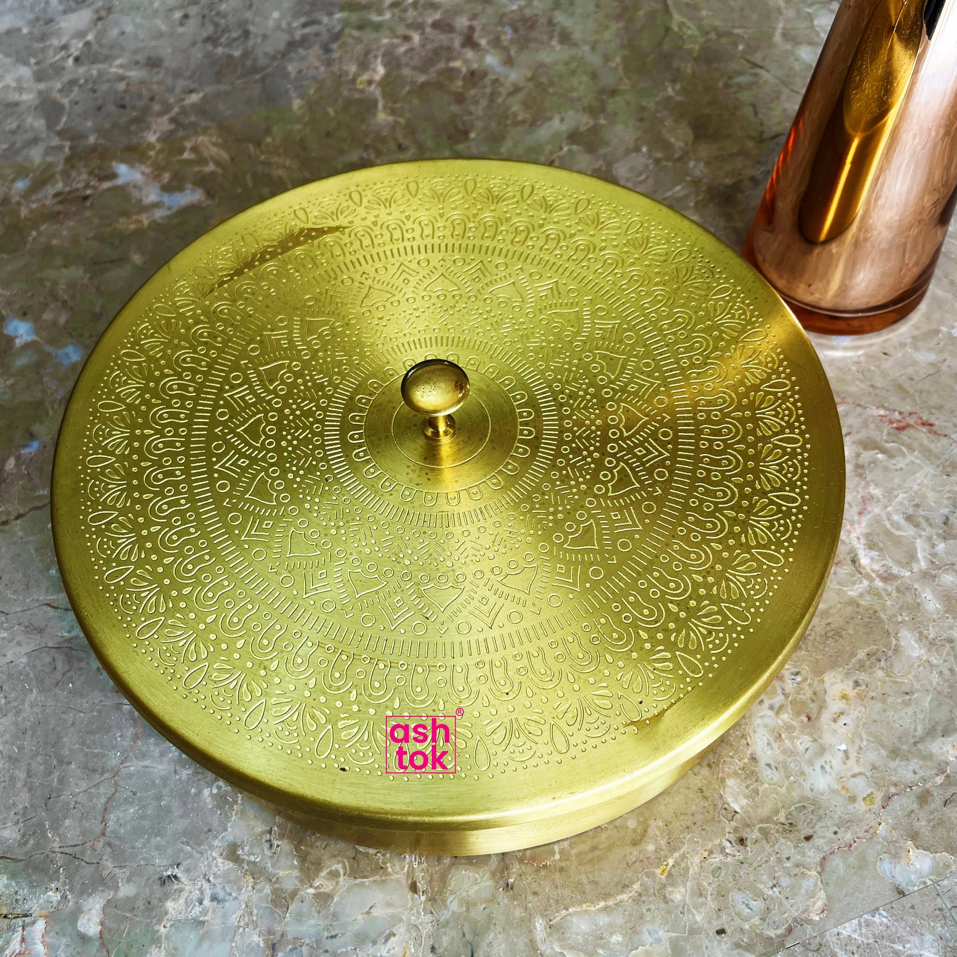 A brass masala box is used to store and dispense various spices and seasonings. They are traditionally used in Indian and South Asian cuisine to keep a variety of spices on hand for cooking. The masala box is made of brass, a type of metal alloy that is made up of copper and zinc.