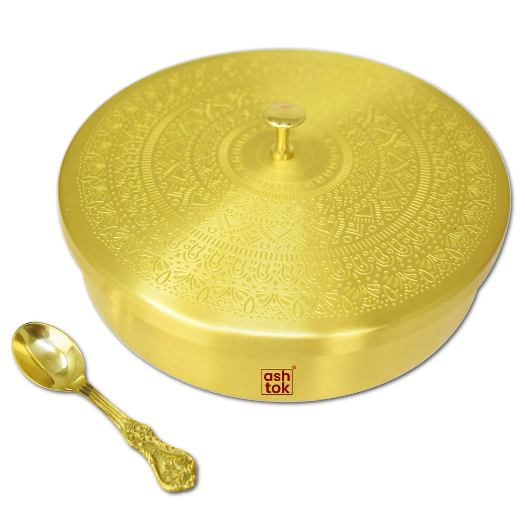 Product Details: India is famous for its spices around the world. Almost 6 to 7 spices on average in all dishes daily in the sub-continent. So, it is quite difficult to keep all the spices in separate boxes. If we can have all the spices in one single box, then it will make life easier and more organized. Ashok introduced a masala box with a diameter of the box is 7 Inches and a Height is 2 Inches. The box comes with 7 cups of Diameter of 2 Inches and a Height of 1.25 Inches. The 7 cups are used for different spices. The box is provided with a lid that has floral engraving work on it. The lid is provided with a knob to pull the lid when in use. The box is made of thick brass sheets. The sizes of the cups are such that they get fixed in the box and are not easily movable. This will prevent the spices from spilling out of the box.