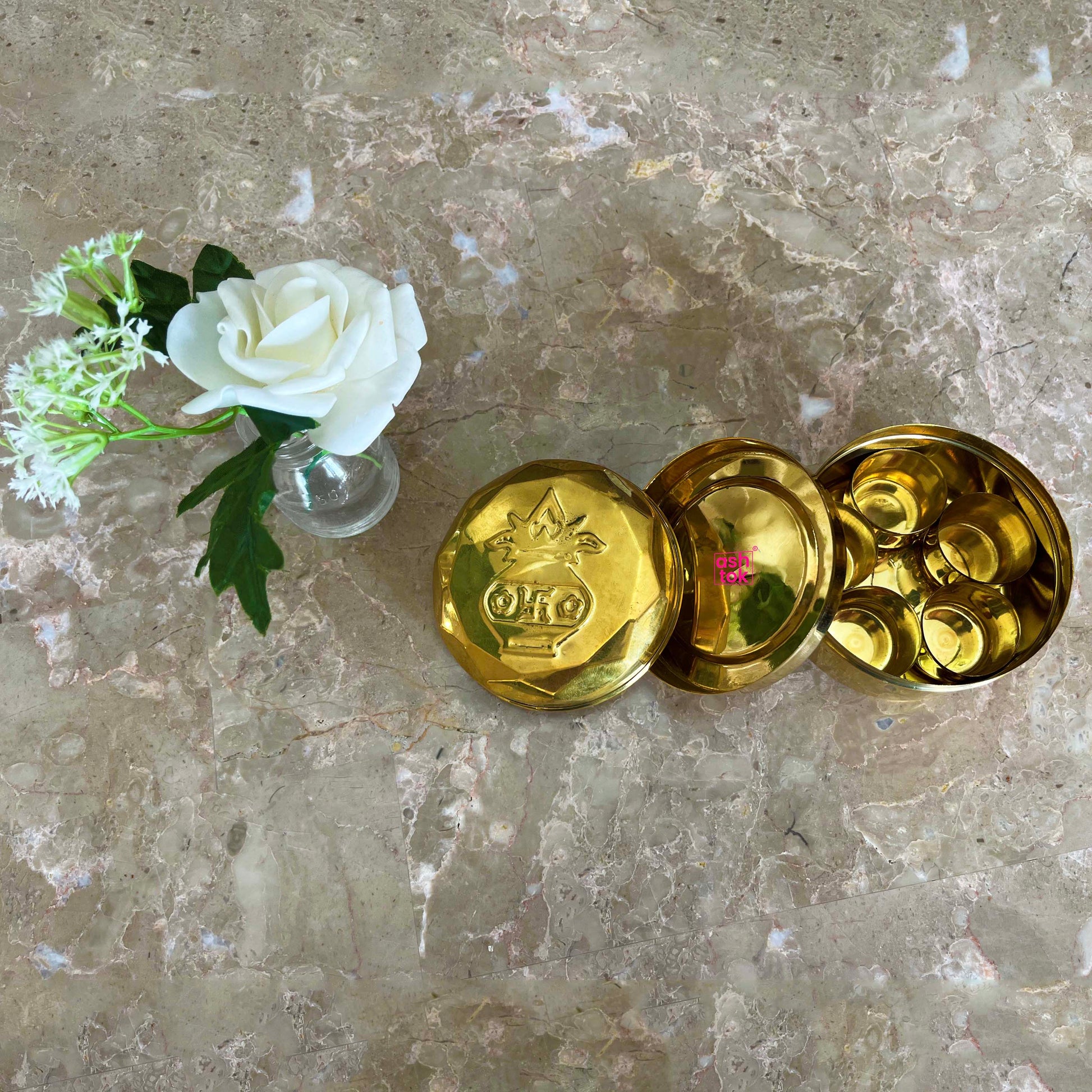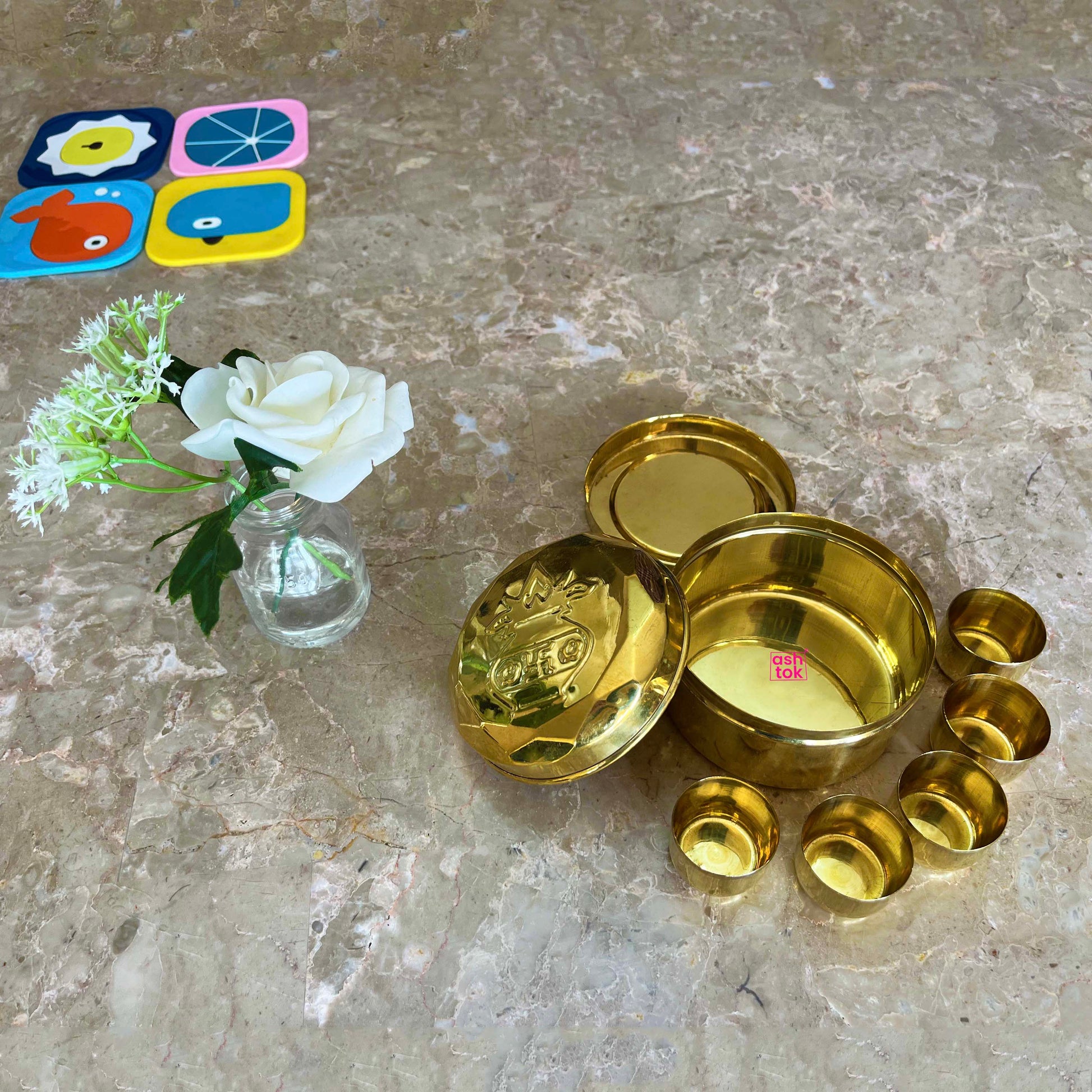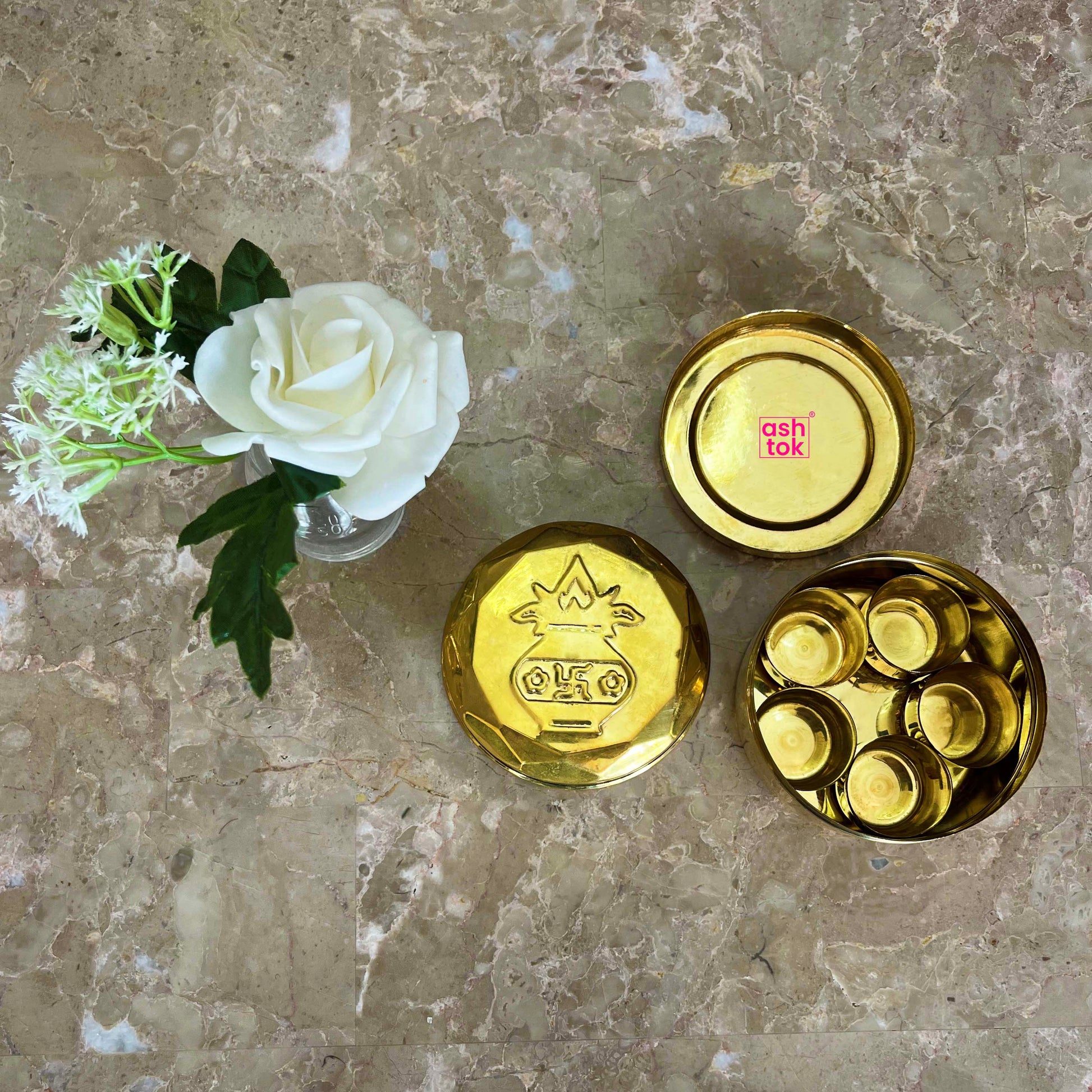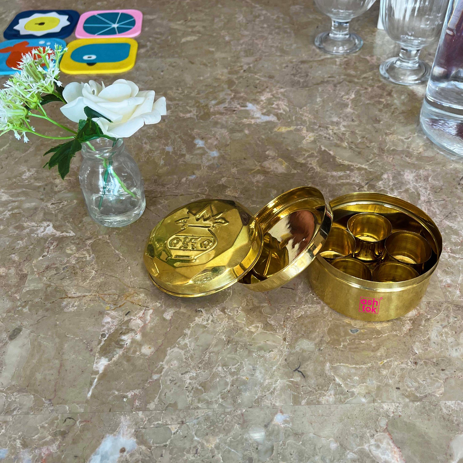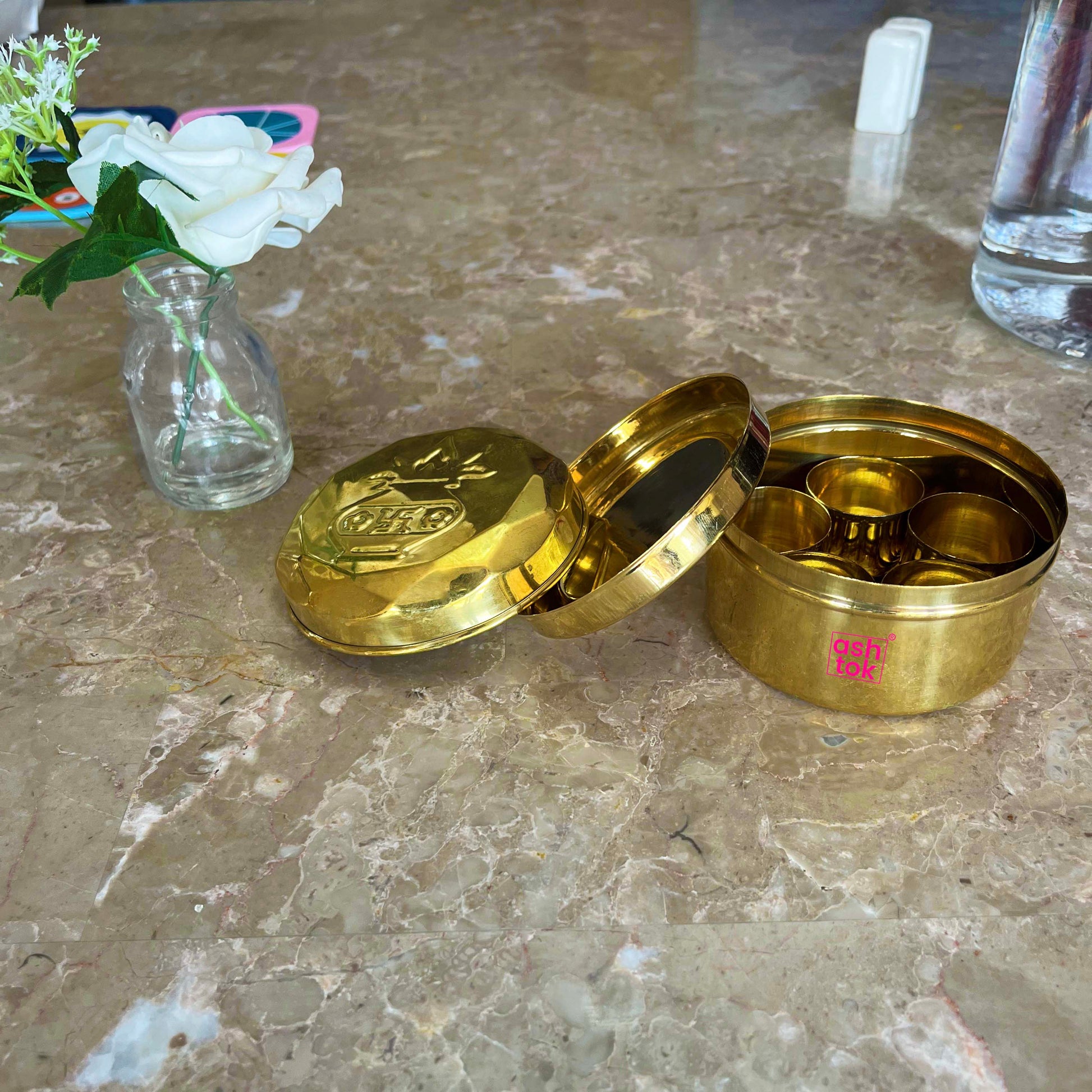 Product Details: Ashtok has the best brass spice box for storing Indian spices. For your kitchen, essentials Ashtok has brought the Brass Masala Box. The Spice Box is entirely made of brass and was handcrafted using traditional methods. The Spice Box has 5 compartments. Save your flavorful food Recipes in this Brass Kitchen Masala Box. Brass has numerous health benefits, which means that by purchasing wonderful handcrafted brass spice containers, you are contributing to a more environmentally friendly environment. Our handcrafted spice box set is ideal for Diwali, Christmas, Anniversary, and Birthday gifts. Your friends, family, and guests will admire this Gold Masala Box. Ashtok is the ideal place to buy the brass spice box online. Please visit our website for more information. A brass spice box can be used to serve mouth fresheners, candies, or dry fruits to guests at a party or to be permanently placed at a center or dining table; it can also be used as a Sewing Kit to keep your threads, needles, and buttons in one place; and it can be used as a spice storage box.