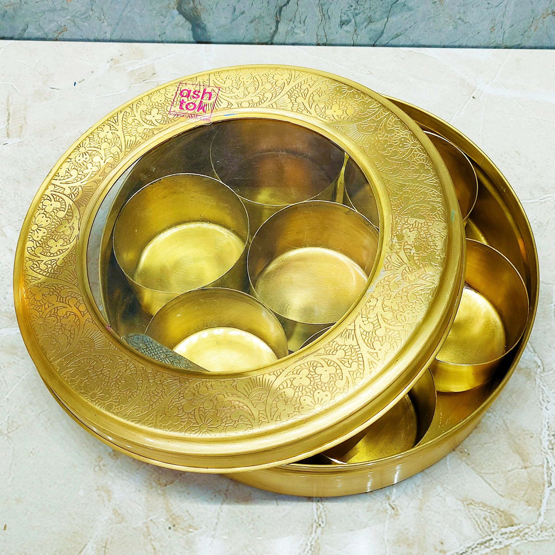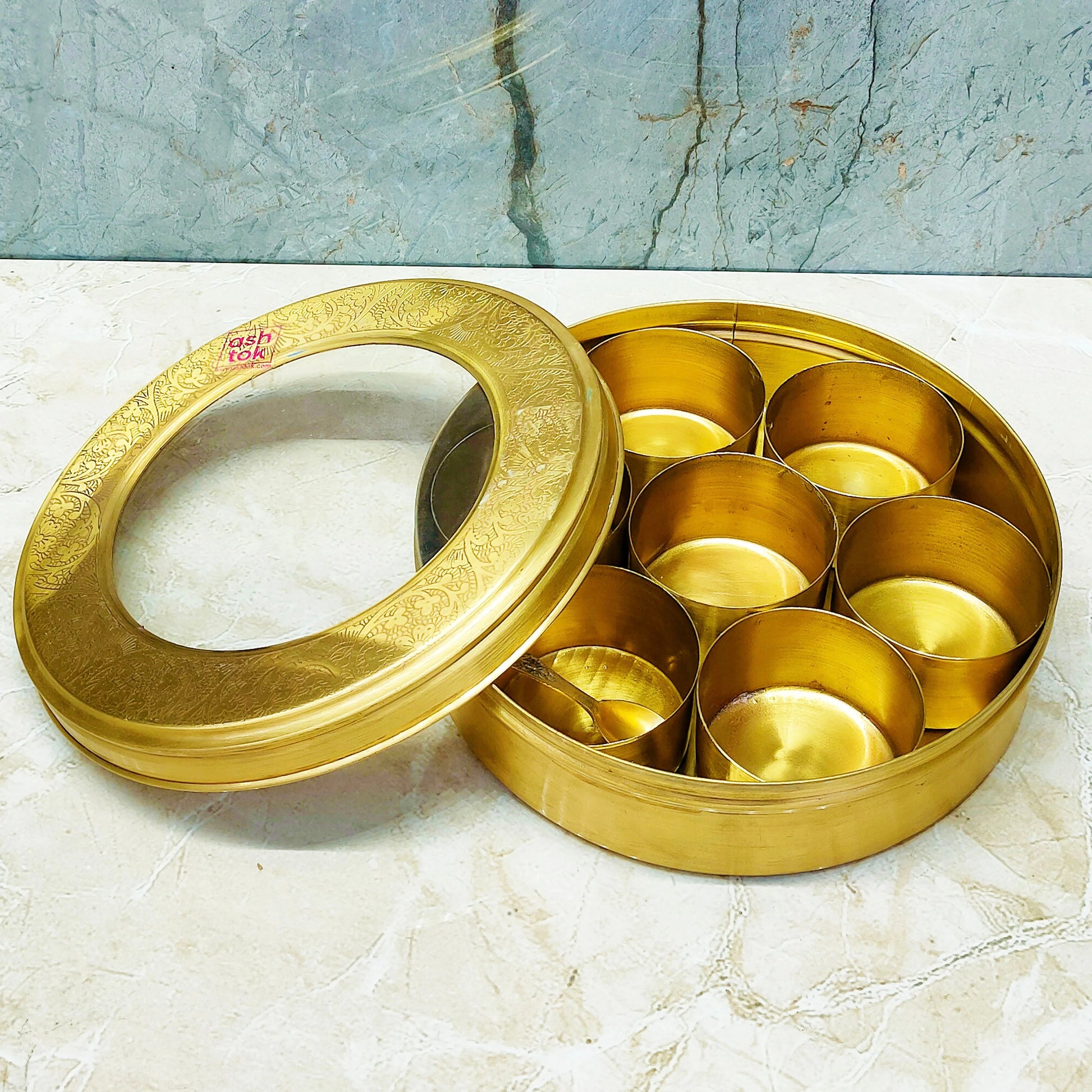 Best Quality Pure Brass Masala Box with Glass Lid. Designed by Ashtok. We provide the most affordable prices and free shipping throughout India.