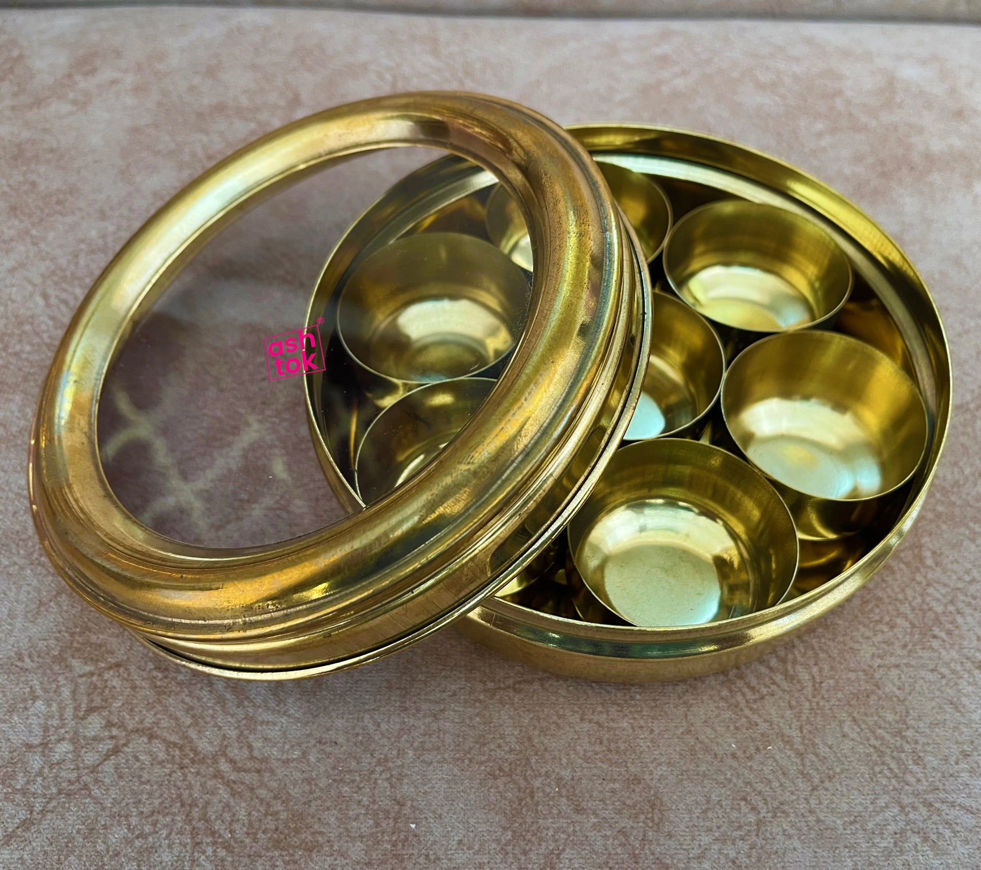 Brass Masala Dabba With Glass Lid, Spice Box, Storage Box with 7 Cup Bowls