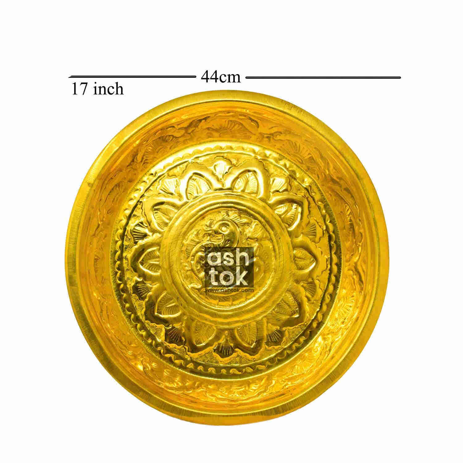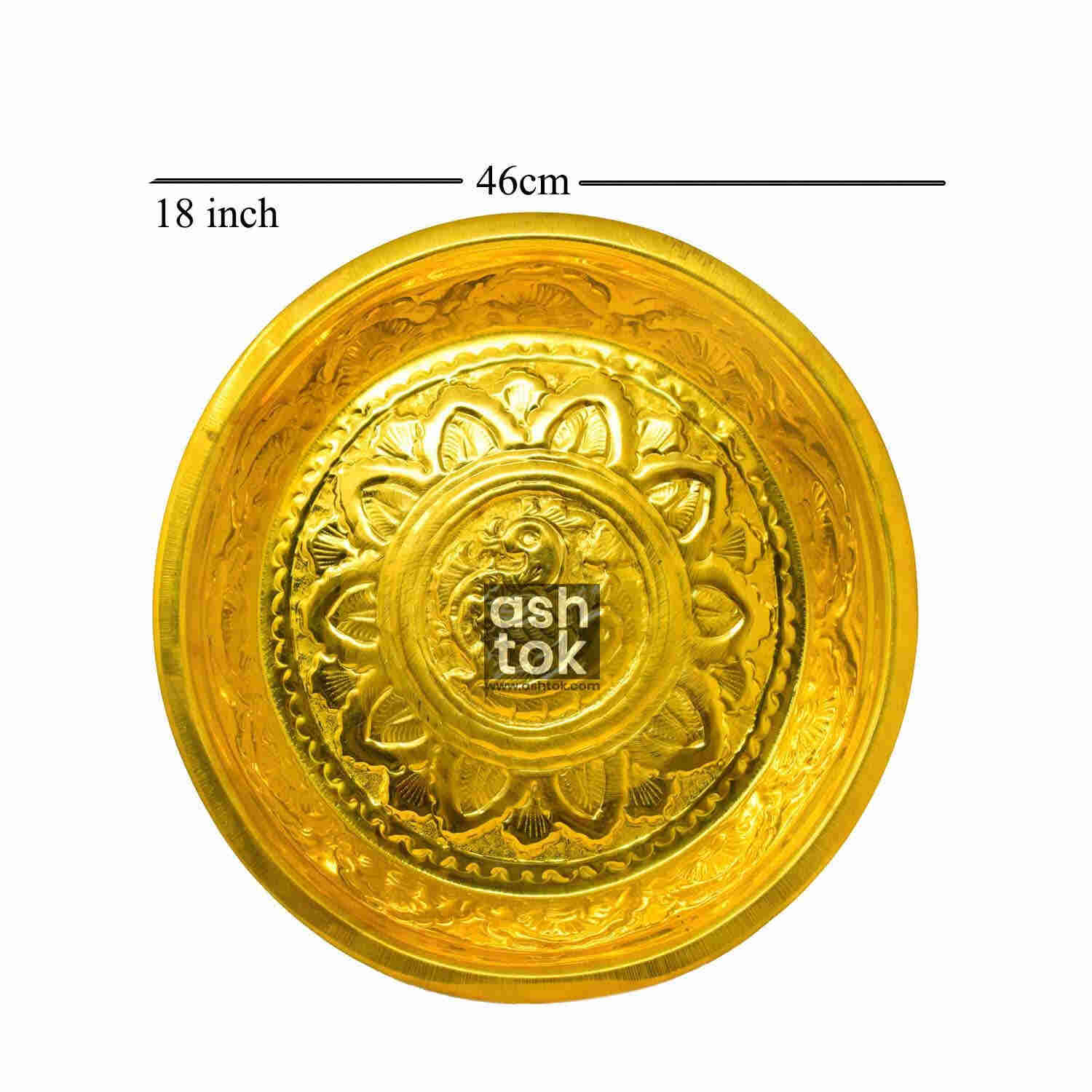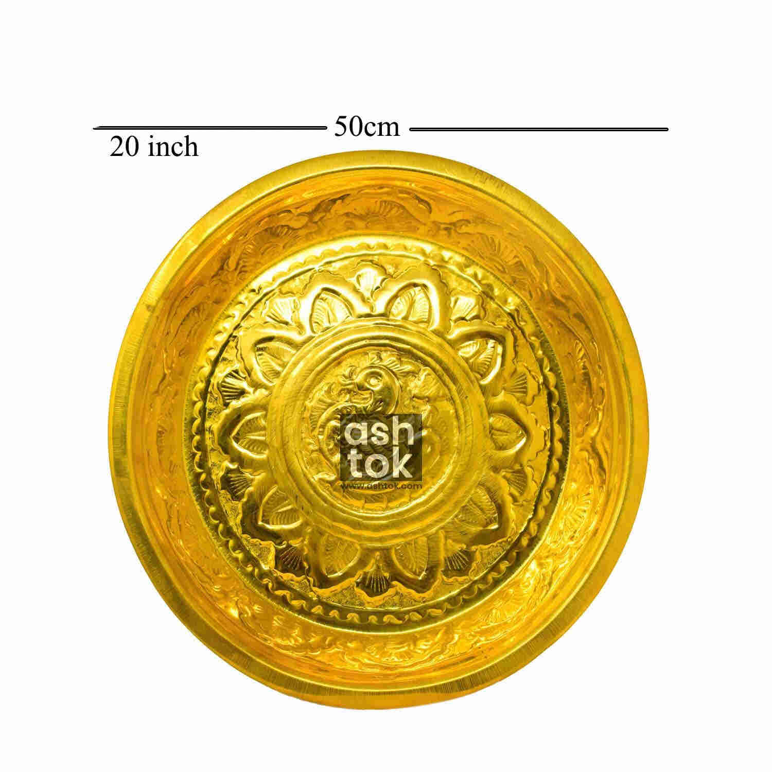 Product Details: Large circular plate made of Pure Brass. The Brass Parat features a beautifully engraved pattern of a peacock in the center with a sunflower circling it. This lovely brass parat will complement the décor of your kitchen. The large brass plate features high edges that allow the components to be adequately occupied while also allowing for simple spill-free mixing. Brass parat is constructed of strong gauge material and is extremely durable. It is necessary for metal equipment in any kitchen. Parat is primarily utilized in the preparation of chapati dough. The big flat surface of a brass parat allows for simple mixing of ingredients. It may also be used to serve a whole meal by placing bowls on it. Furthermore, brass parat is frequently used in marriage rites such as ring finding, arranging presents within it and presenting it to the bride, and so on.