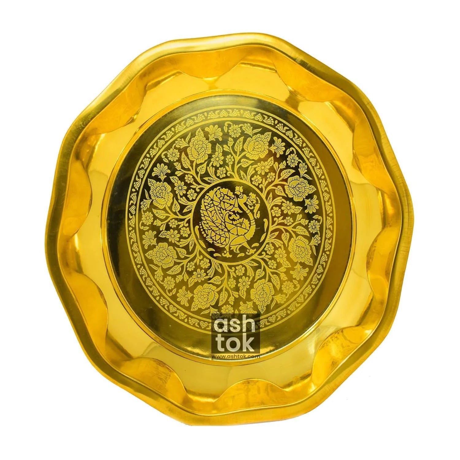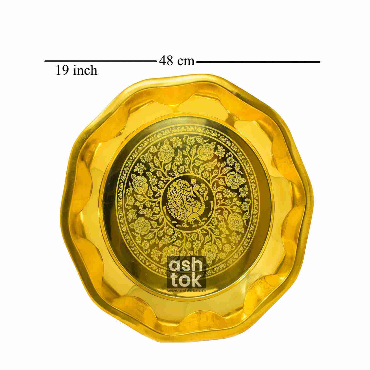 Product Details: Large plate made of Pure Brass in a decagonal circular form. The Brass Parat has been beautifully laser printed with a peacock in the center and flowers all around. This lovely brass parat will complement the decor of your kitchen. The large brass plate has raised boundaries to appropriately occupy the components and to allow smooth spill-free mixing. Brass parat is composed of strong gauge brass and is extremely durable. It is a necessary culinary implement made of brass. Brass Parat is mostly used to make chapati dough. The big flat surface of the brass parat allows for the simple mixing of substances. It may also be used to serve a whole meal by placing bowls on it.