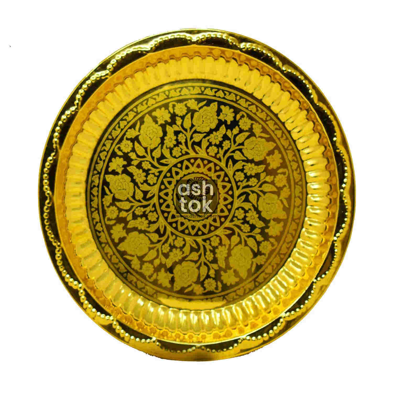 A Brass Laser Printed Nakshee Tapku Brass Plate is a traditional Indian plate used for religious and ceremonial purposes. The plate is made of brass and features a laser-printed design of "Nakshee" or traditional Indian art on it. It is also called Tapku Brass Plate. Nakshee art is a traditional Indian art form, which is characterized by intricate designs and motifs that are hand-drawn or printed. The designs often depict religious symbols, deities, or scenes from Indian mythology. The laser printing technique is used to create highly detailed and precise designs on the plate, which can be difficult to achieve through traditional methods of engraving or embossing.