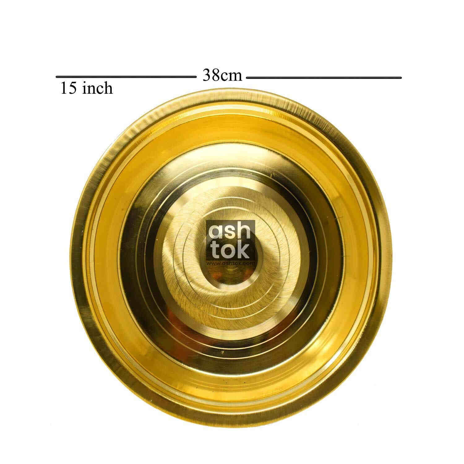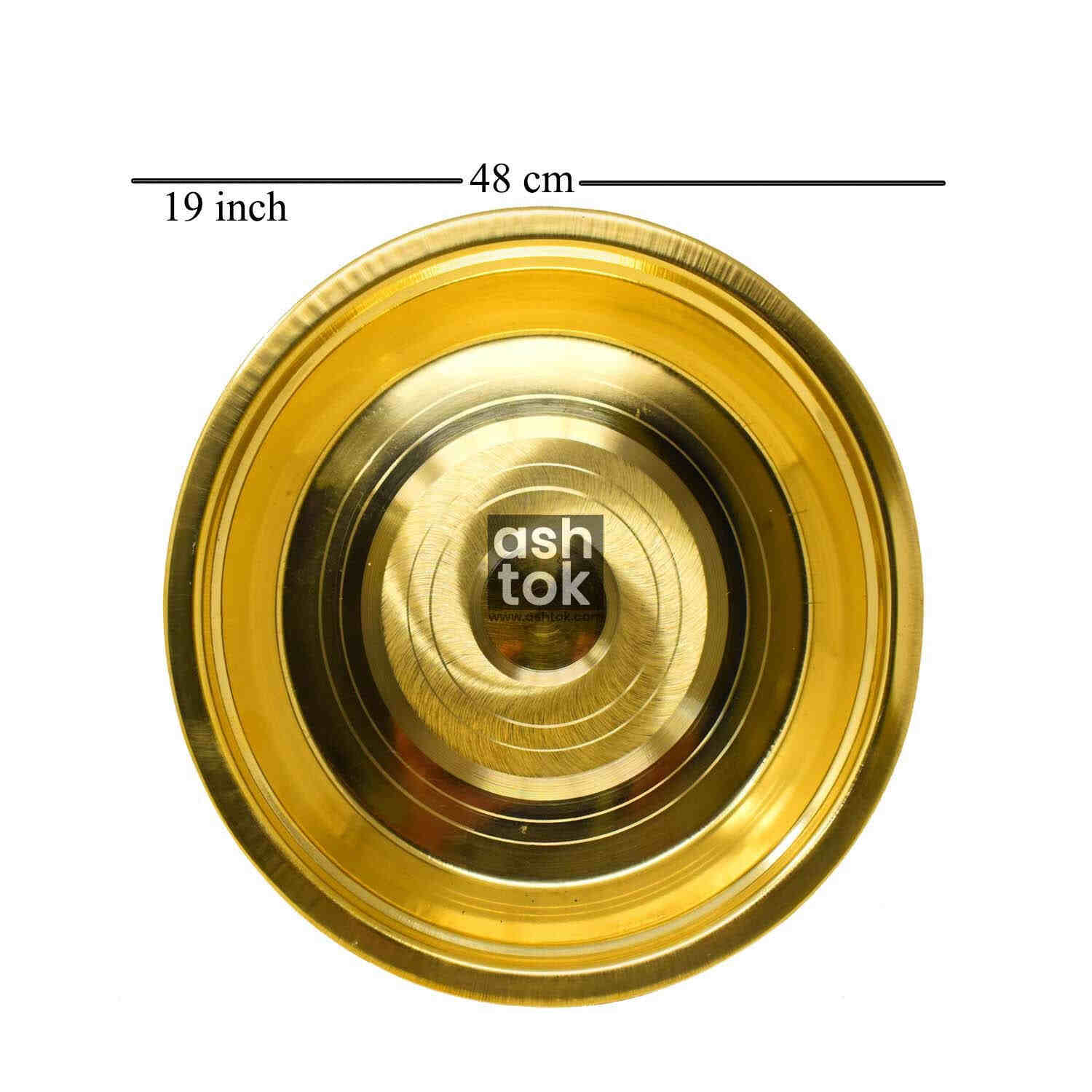 Product Details: Big plate made of Pure Brass with an interior circular ring pattern. Brass Parat features elevated edges that allow the components to be adequately occupied while also allowing for simple spill-free mixing. Brass parat is constructed of strong gauge material and is extremely durable. Brass Parat is necessary culinary equipment. It is mostly used for making dough for chapati. The big flat surface of a brass parat allows for the simple mixing of substances. With bowls on it, it may also be used to serve a whole dinner. Furthermore, brass parat is frequently used in many marriage ceremonies such as ring finding ceremony, arranging presents within it and presenting it to the bride, and so on.