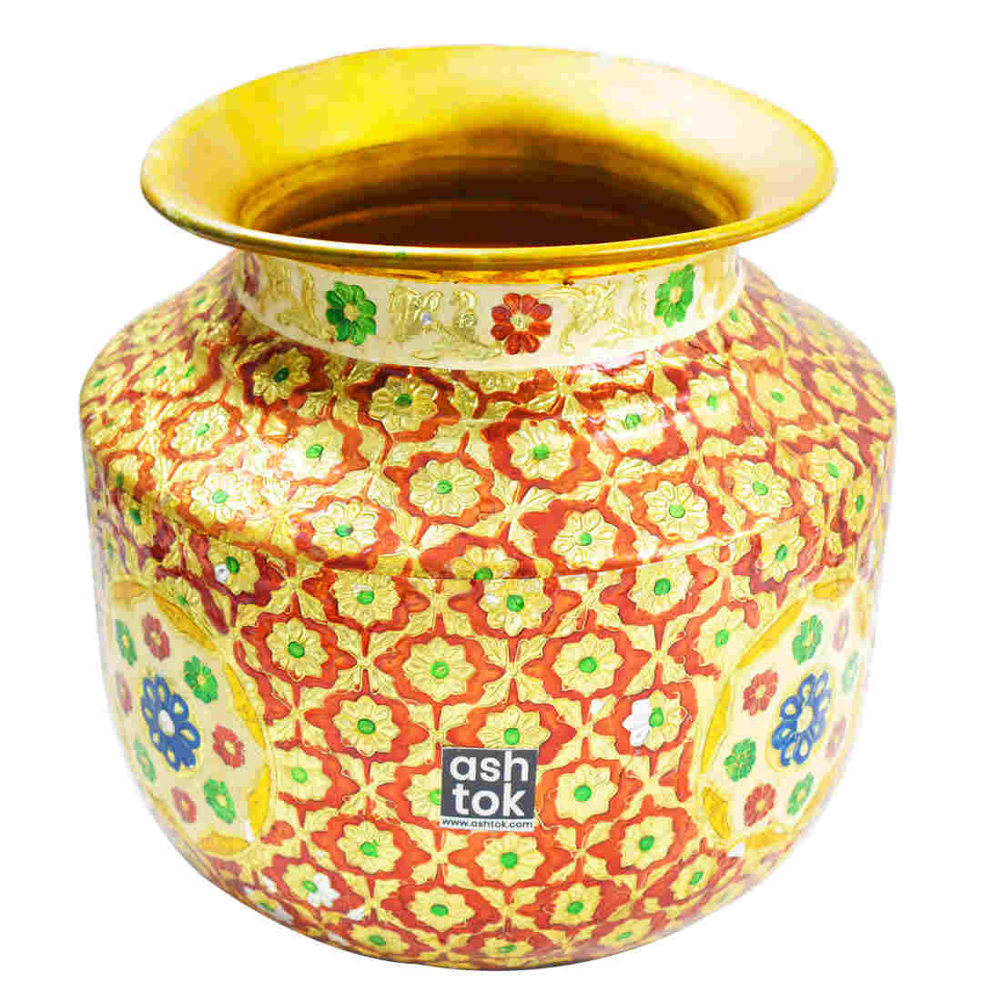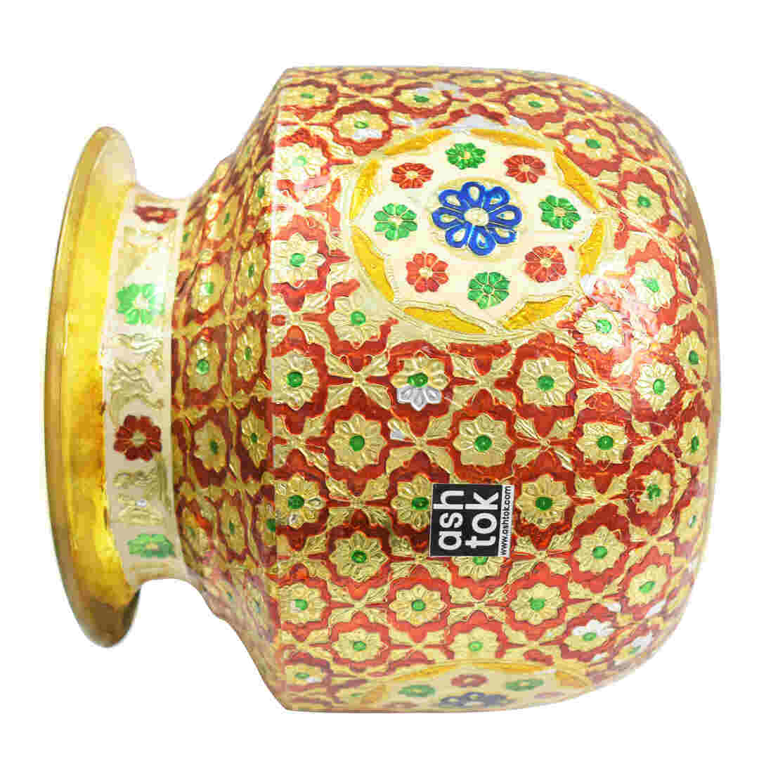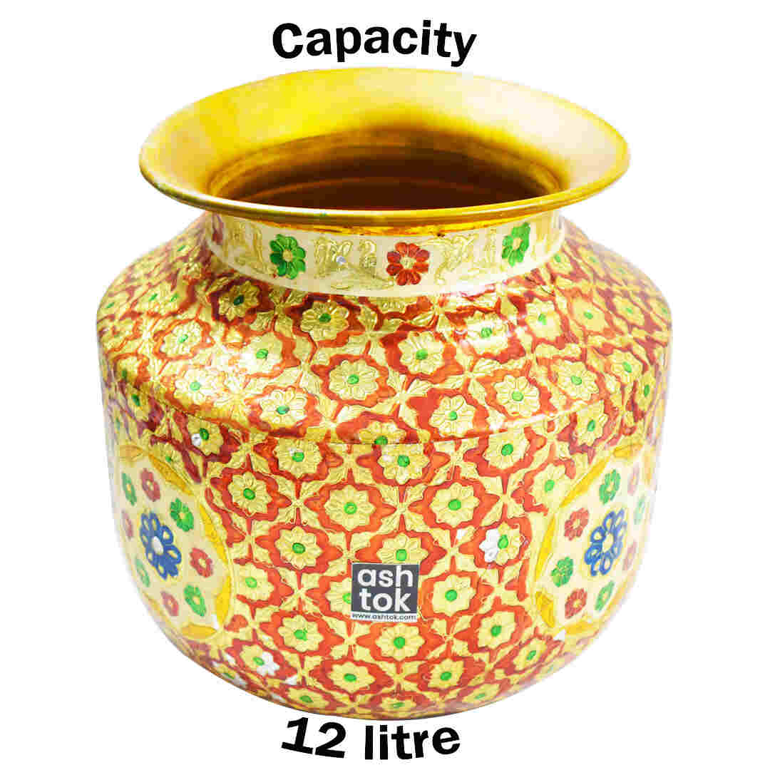 Product Details: Handcrafted Pure Brass Water Pot with Meena work in Red and Green. The brass Meenakari Ghada features round edges and a broad mouth. Its attractive appearance and qualities make it ideal for use in marital ceremonies such as ring ceremonies and Pooja rituals. The Meena work done on the brass metal keeps it from oxidizing and provides minimal upkeep and easier cleaning. Put this eye-catching brass Meenakari pot on a display or shelf to add beauty to your home decor. Because of its distinctive, functional, and appealing properties, Meenakari Brass Pot may also be a valued gift item. Brass pots are specifically made for marriages, ring ceremonies, and gifting purposes during weddings, housewarming celebrations, and so on.