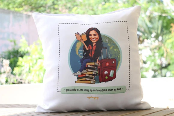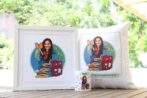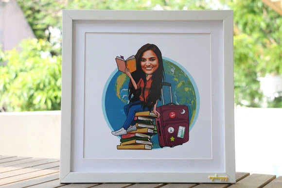 Instead of a regular caricature, we add an extra touch by including any 2 things which the special person loves doing. In the sample photos, for example, a suitcase and books have been added for her love of reading and travelling.
