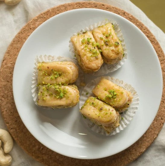 Delicate and rich, our Cashew Bud features finely chopped cashews nestled in soft, sweet filo, shaped like a flower bud and dripping with syrup.