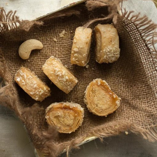 Savor the rich texture of our Cashew Turkish Roll, a luxurious roll of filo filled with finely ground cashews, sweetened with a hint of honey.