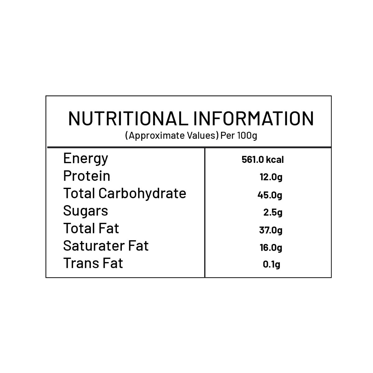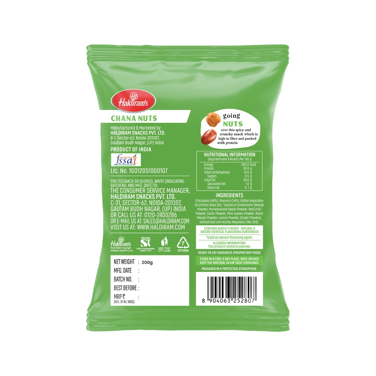 Chickpeas (40%), Peanuts (34%), Edible Vegetable Oil (Cotton Seed Oil), *Spices & Condiments (Mango Powder, Pomegranate Seeds Powder, Red Chilli Powder, Garlic Powder, Mint Leaves Powder, Black Pepper Powder, Lemon Power, Ginger Powder), lodised salt and Acidity Regulator (INS 330).