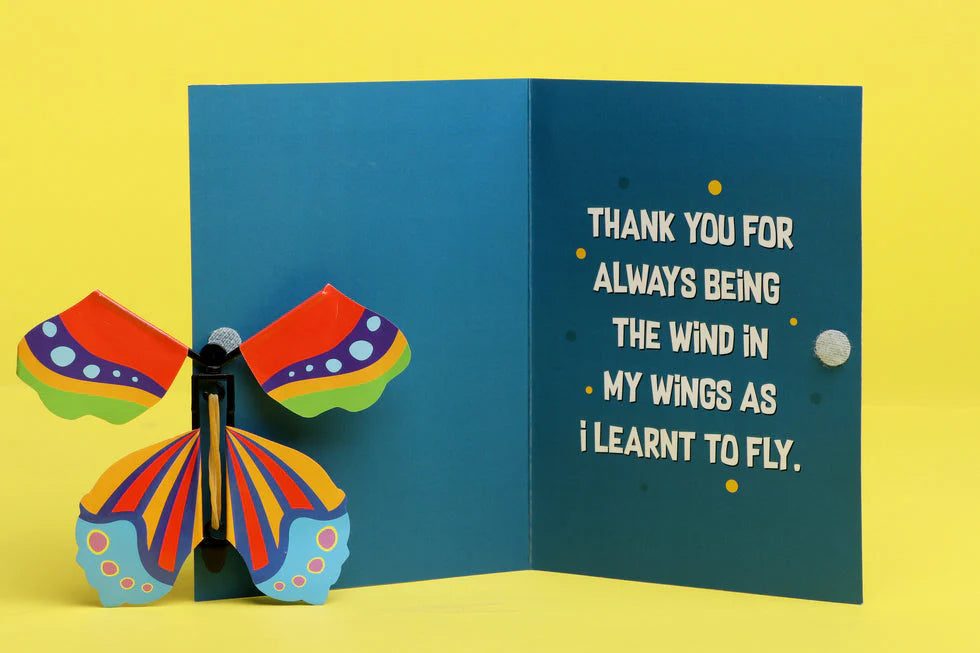 The card has to be opened with a mild jerk for best results. Sometimes, the butterfly tends to get tired during the shipment journey. If possible, we request you to open the card when you receive it and twist the butterfly’s tail the same way you rotate a key to recharge it. Once you’ve completed the motion 40-50 times, place it inside the card and close it.