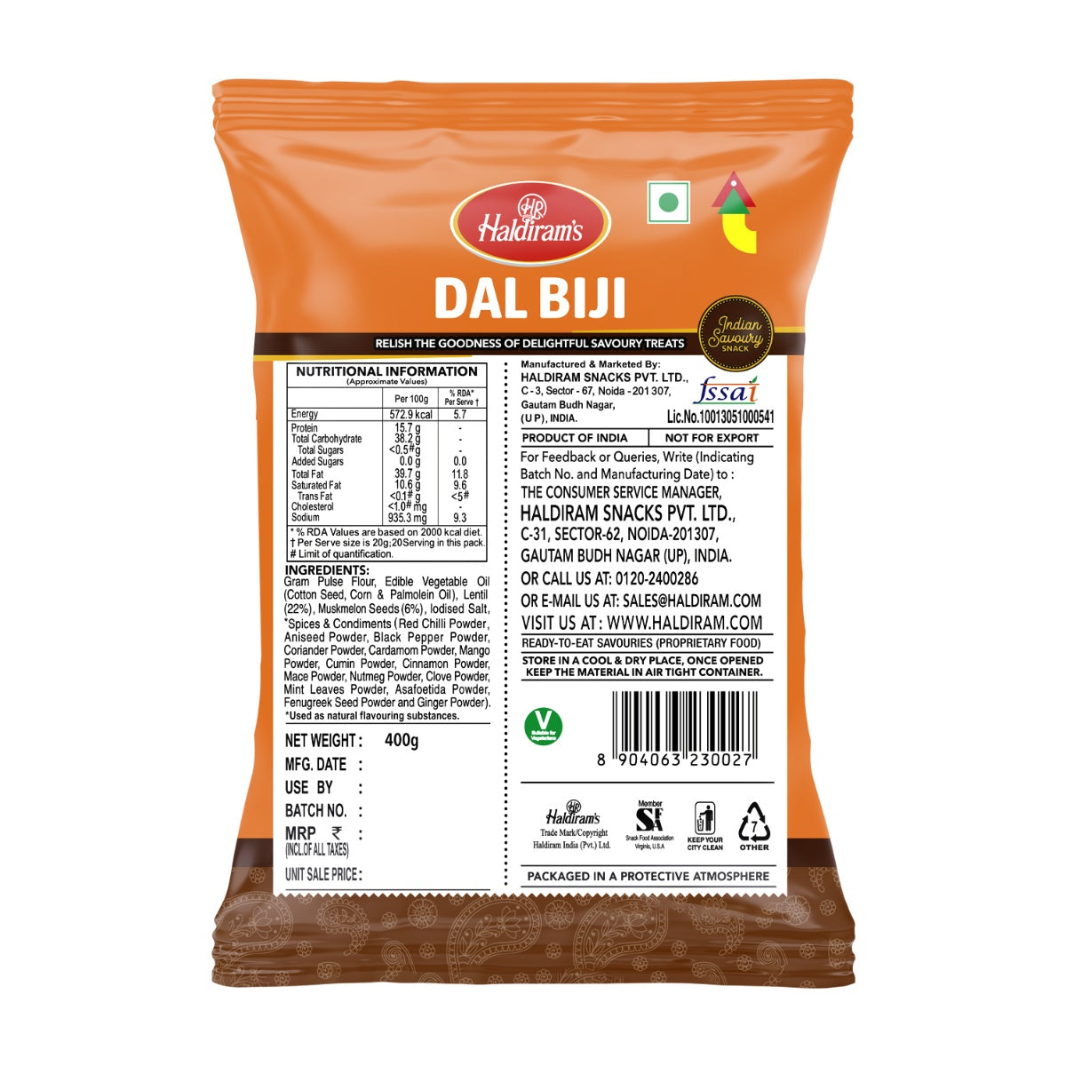Haldiram's Dal Biji Namkeen is a savory snack that features crispy lentil flakes as the star ingredient. The snack begins with lentils that are soaked, ground, and flattened into thin flakes. These lentil flakes are then deep-fried to achieve a light and crispy texture while maintaining their natural flavor. The fried lentil flakes, or dal biji, are then seasoned with a carefully selected blend of spices and seasonings. This mixture typically includes ingredients such as salt, black salt, chili powder, turmeric, cumin, and other flavorful spices.