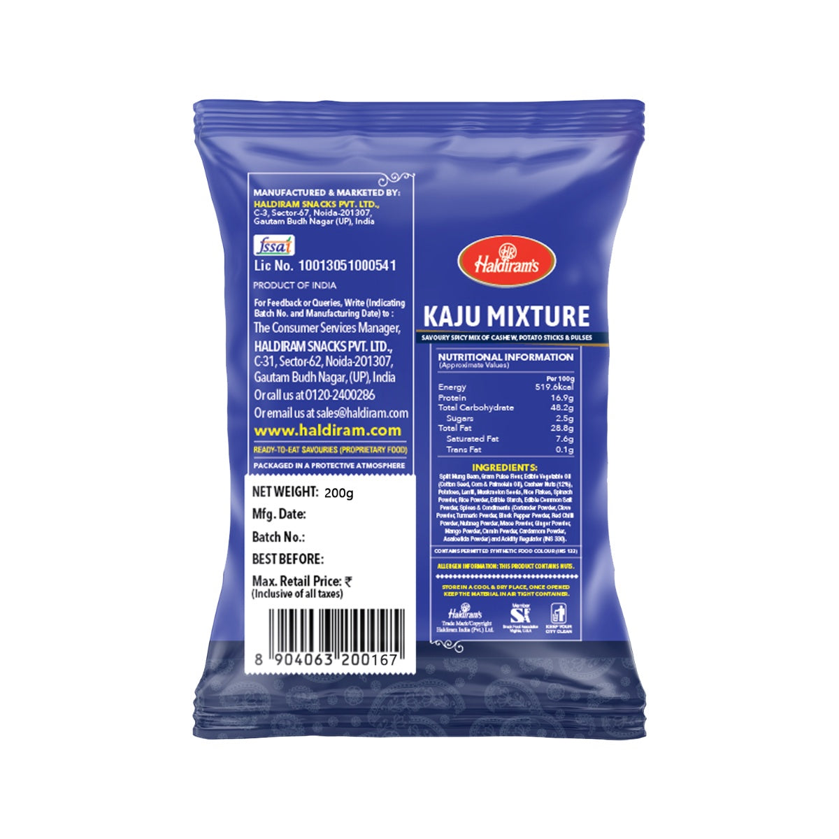 Haldiram's Kaju Mixture Namkeen is a savory snack that showcases the richness of cashews (kaju) combined with a variety of other ingredients. The snack features a blend of crispy elements, including sev (fried noodles), roasted peanuts, lentil noodles, and various other crunchy components. The star ingredient of this namkeen is the cashews (kaju), which provide a rich and creamy texture along with a mild sweetness.