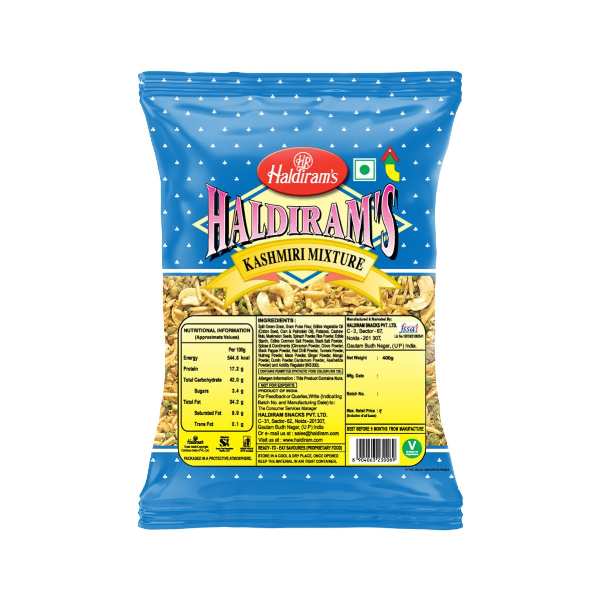 Haldiram's Kashmiri Mixture Namkeen is a savory snack that brings together the authentic flavors of Kashmir. The snack combines a variety of crispy ingredients, carefully selected spices, and aromatic seasonings, creating a delightful taste experience. The Kashmiri Mixture Namkeen typically includes a blend of crispy elements such as fried lentil noodles (sev), roasted peanuts, flattened rice (poha), crunchy gram flour noodles (bhujia), and other crunchy components. These ingredients contribute to the snack's unique texture, offering a satisfying crunch and a diverse mix of tastes.