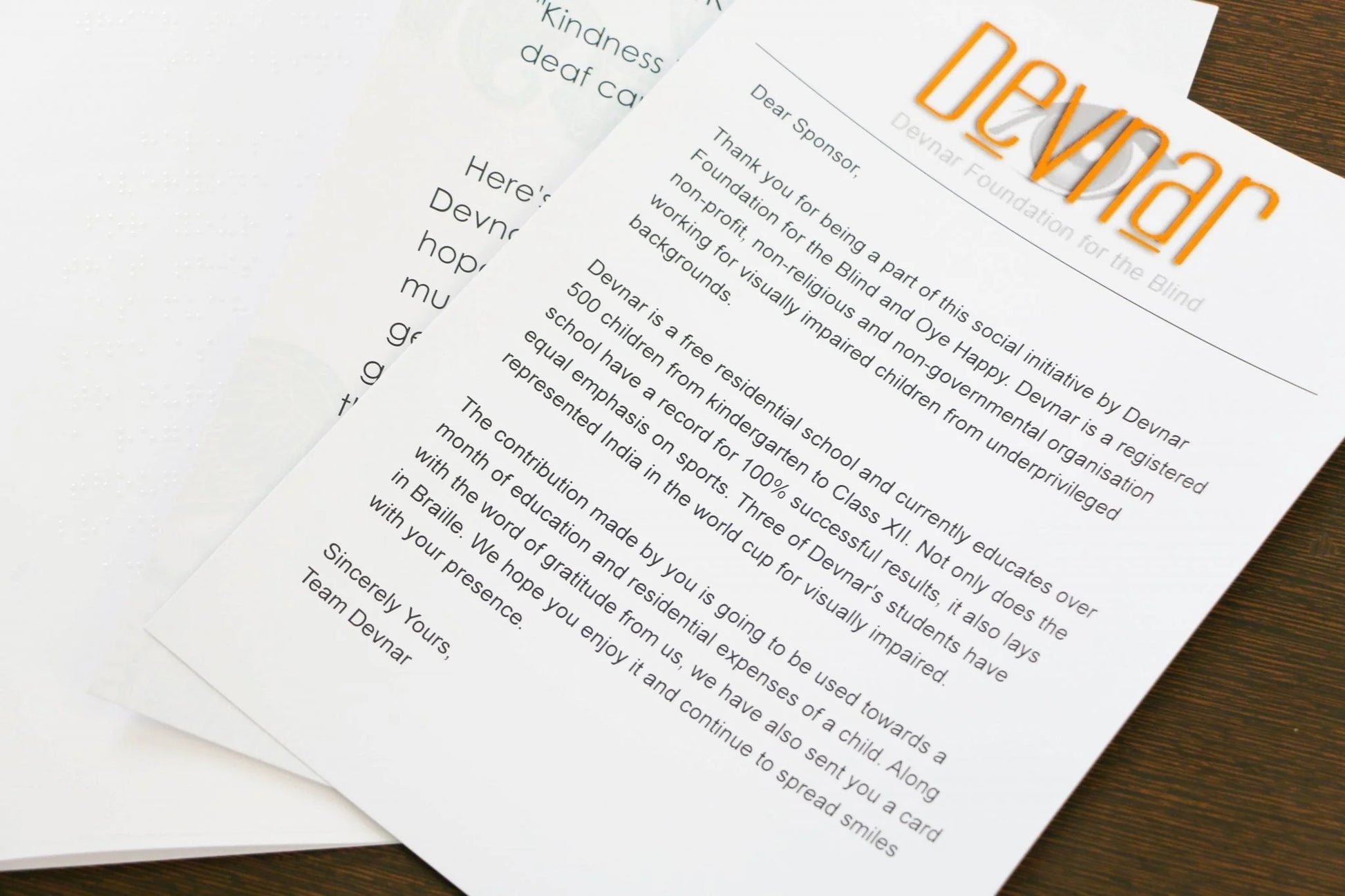 - The NGO is Devnar Foundation, which works with visually-impaired children from underprivileged backgrounds. You can learn more about the NGO here - http://www.devnarfoundationfortheblind.org/