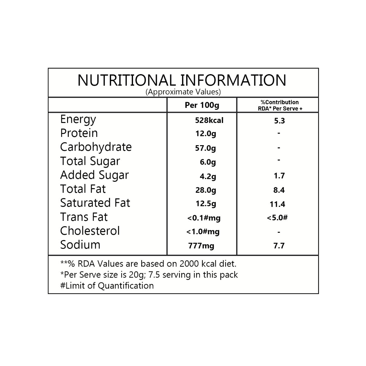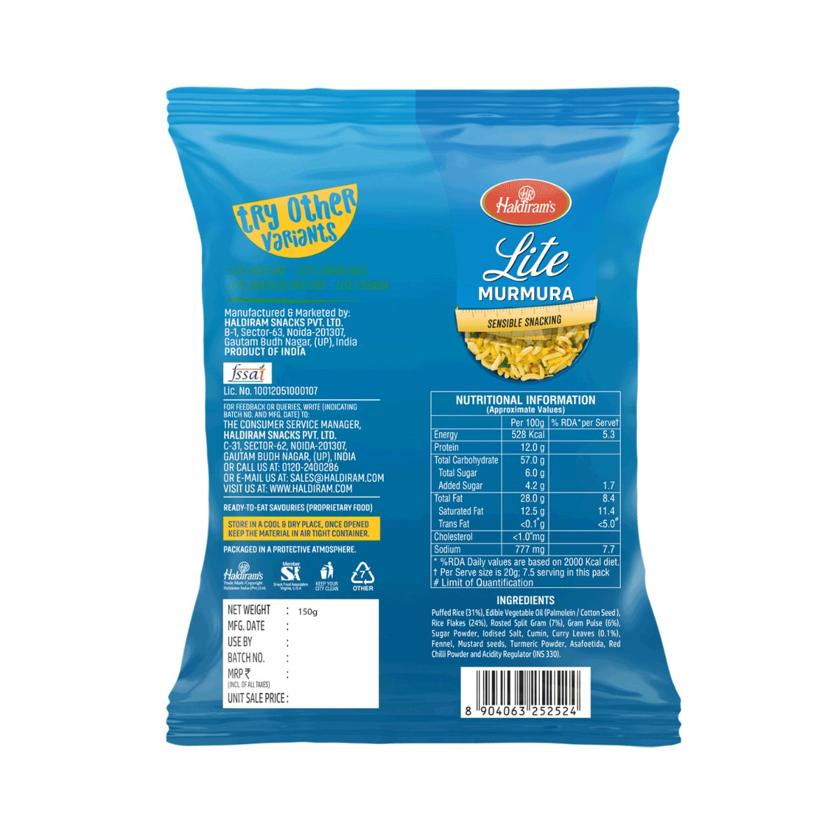 Puffed rice (31%), Edible vegetable oil (Palmolein / Cotton seed), Rice flakes (24%), Rosted split gram (7%), Gram pulse (6%), Sugar powder,Iodised salt, Cumin, Curry leaves (0.1%), Fennel, Mustard seeds, Turmeric Powder, Asafoetida, Red chilli powder and acidity regulator (INS 330).