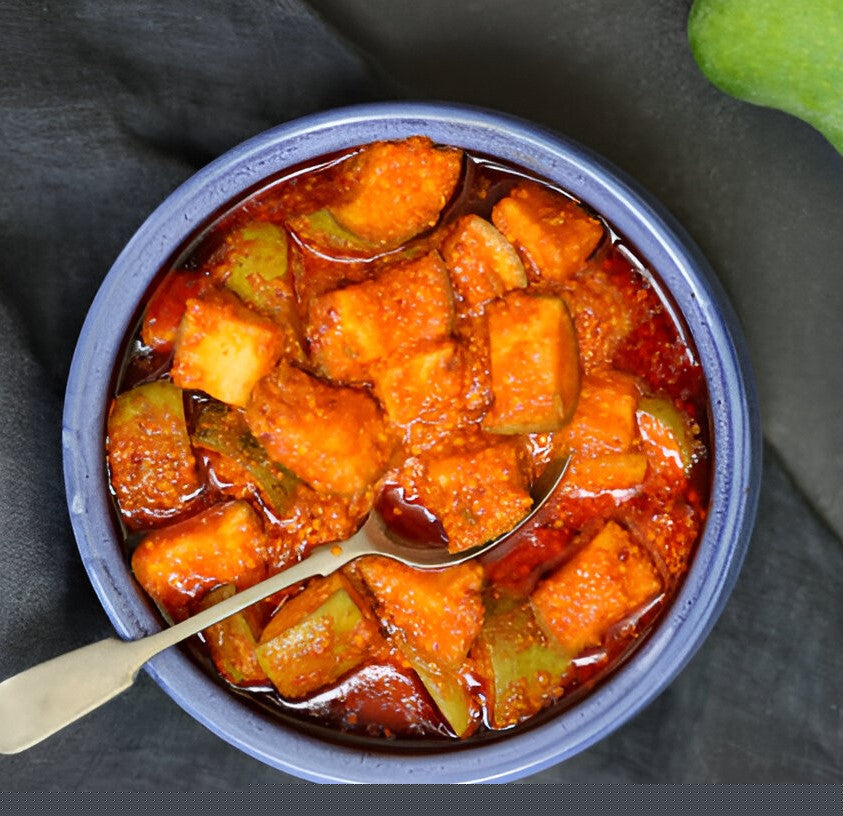 Relish the timeless flavor of Avakaya mango pickle, crafted from our authentic traditional recipe.