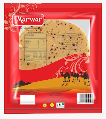 MARWAR offers this vegetarian moong dal papad punjabi flavor weighing 400g. The shelf life of this product is 4 Months and has been made by hand. Pack contains 400 gm moong punjabi papad (extra spicy)