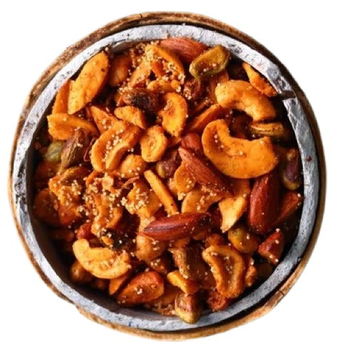 Almonds, Cashews, Pistachios, Raisins, Poppy Seeds, Refined Groundnut Oil, Salt, Red Chilli Powder, Black Salt Powder, Whole Spices