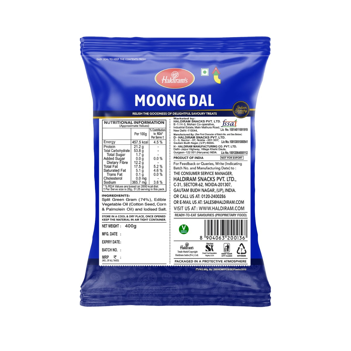 Haldiram�s moong dal is a crispy salted namkeen with the goodness of moong dal. Known for its delicious taste, it satisfies your small hunger pangs anytime, anywhere. Haldiram��s moong dal is a perfect companion for your tea time with family and friends. It is a delectable savoury snack that can be enjoyed by itself and can be used as an ingredient to make a tasty chaat. The namkeen is made with the best quality ingredients and is high on fibre and protein.