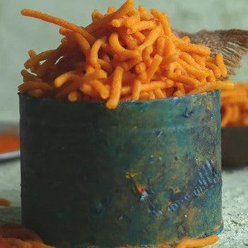 Mota Sev features thick, crunchy gram flour noodles, seasoned with turmeric and ajwain for a bold, flavorful snack.