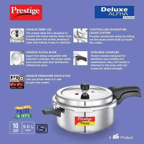 Prestige Deluxe Alpha Svachh Stainless Steel Pressure Cooker with Spillage Control Deep Lid - Silver |