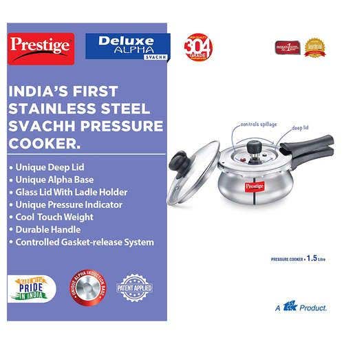 Prestige Deluxe Alpha Svachh Stainless Steel Spillage Control Pressure Cooker (Silver)Handi with Glass lid 1.5L