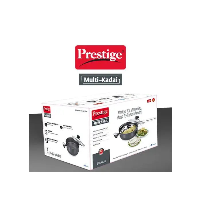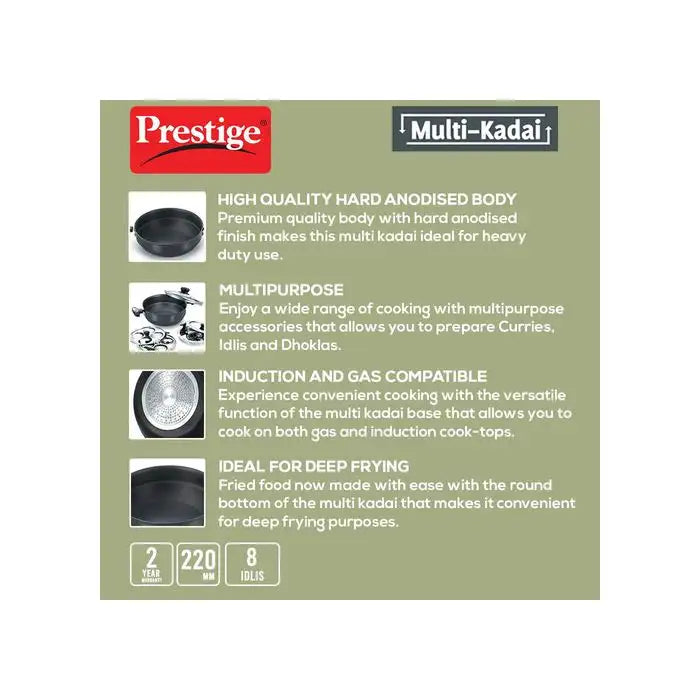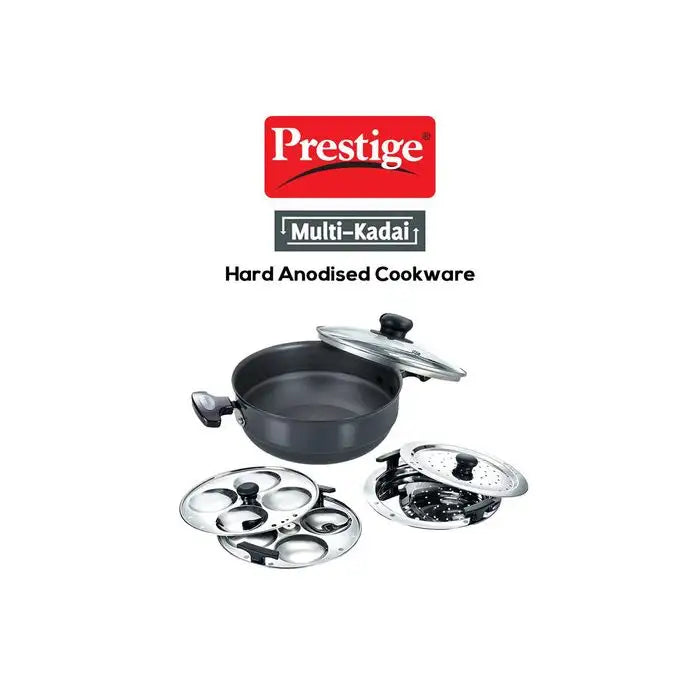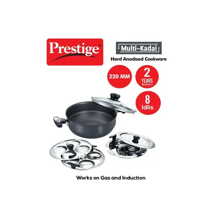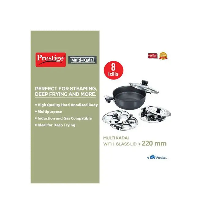 Prestige Hard Anodised Induction Base Multi-Kadai with Glass Lid (Dhokla Plate, Patra Plate, Idli Plates), 22cm (Black) |