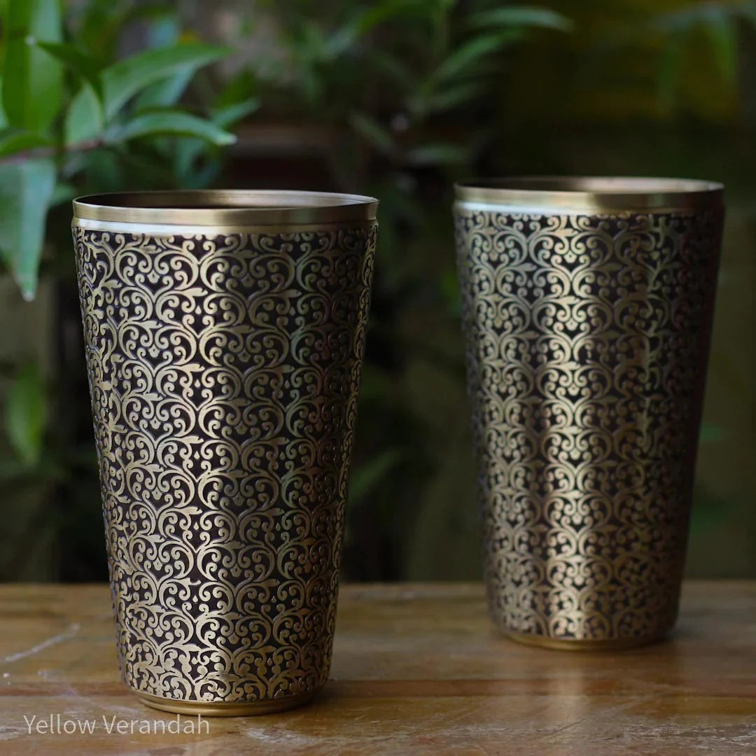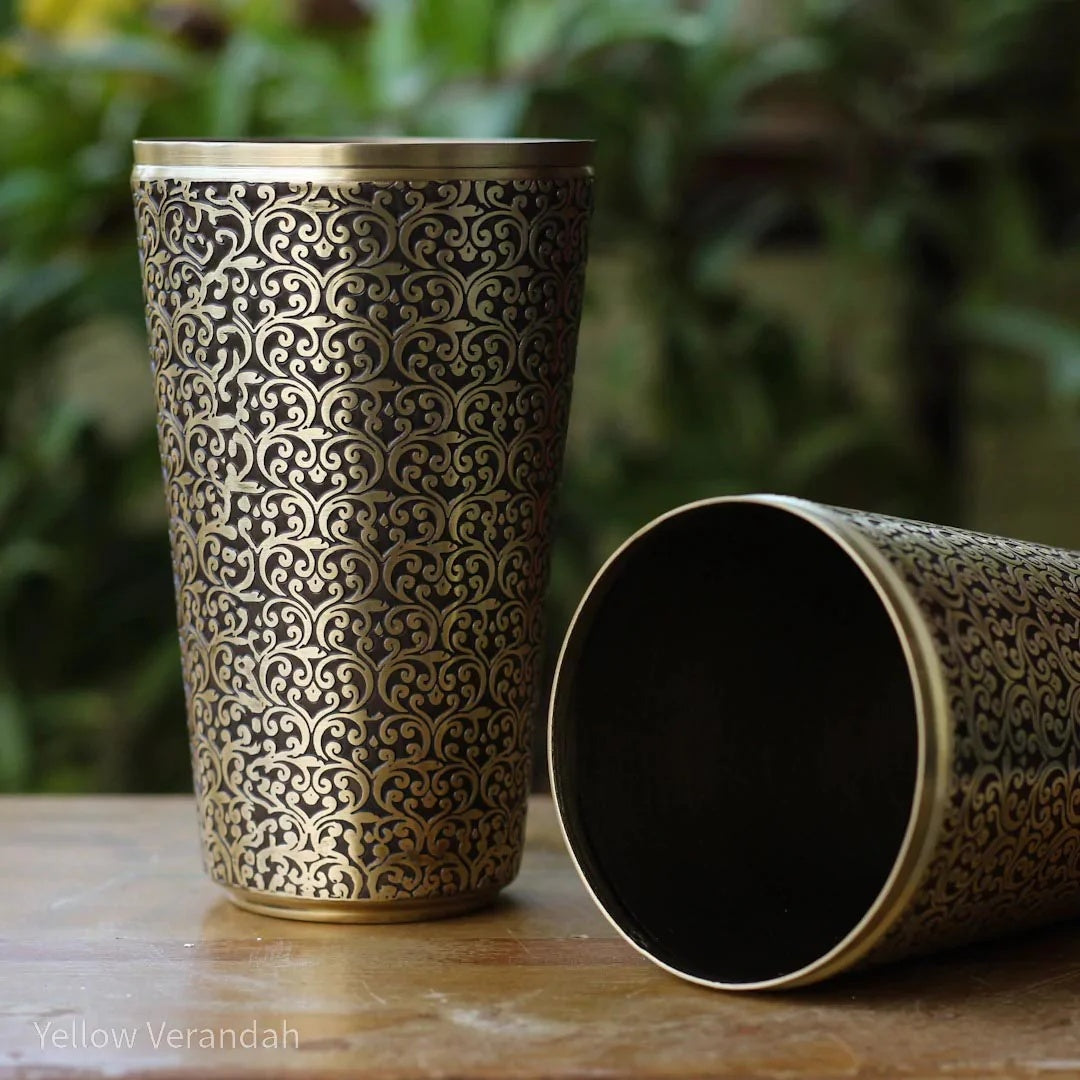 Inspired by radical beauty of Kutch silver crafting & their fine intricacies, these Kachchh Pure Brass Tumblers are beyond utility.