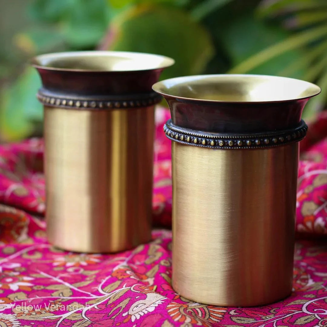 Made of pure Brass, with antique finished Moti Border and Satin finished body texture, these Glasses define subtle elegance & luxury.