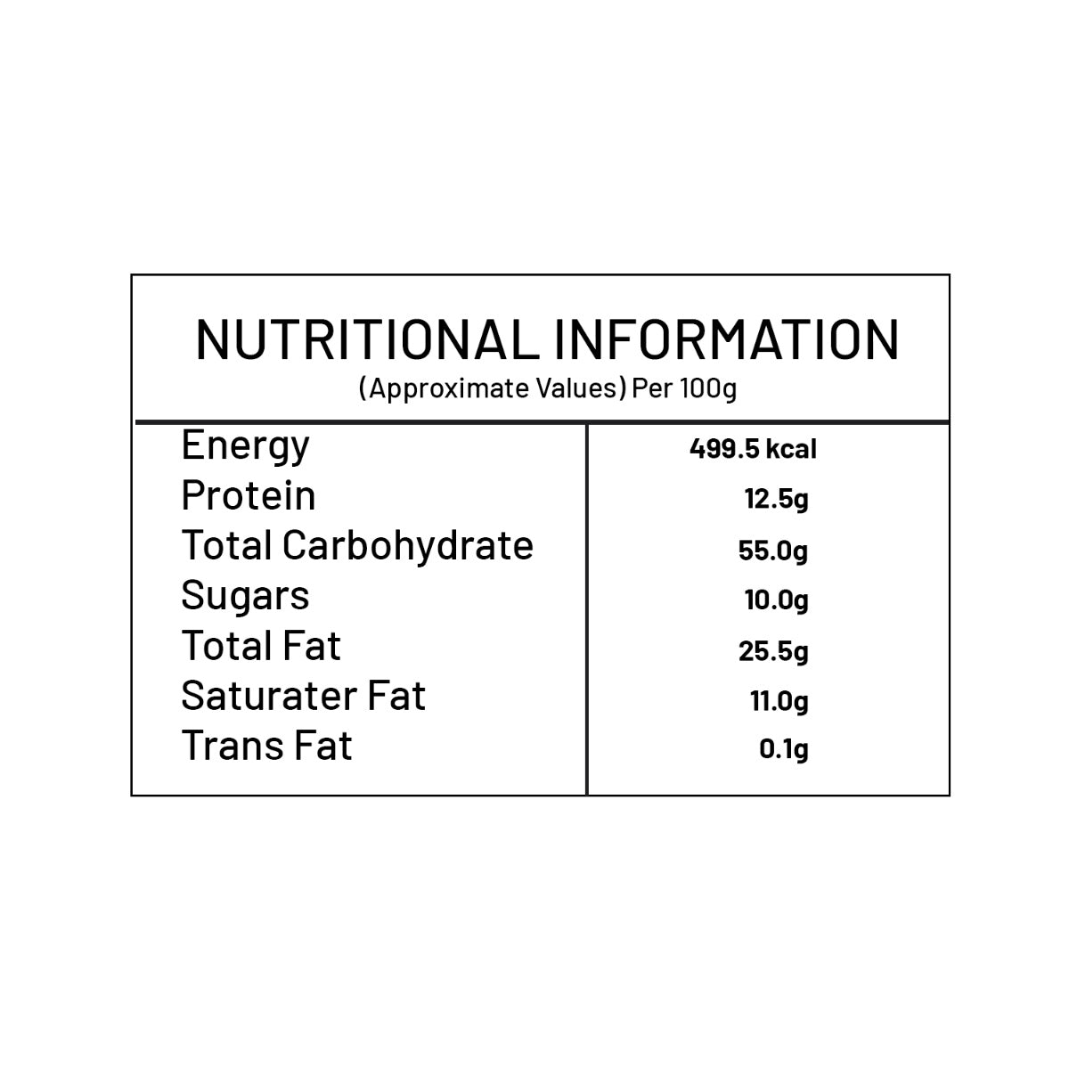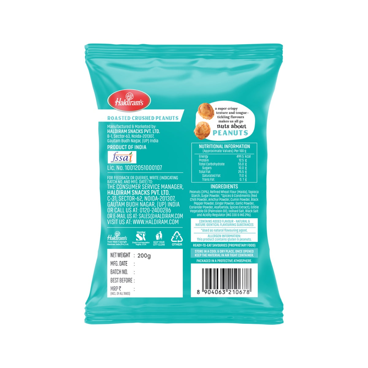 Peanuts (39%), Refined Wheat Flour (Maida), Tapioca Starch, Sugar Powder, *Spices & Condiments (Red Chilli Powder, Amchur Powder, Cumin Powder, Black Pepper Powder, Ginger Powder, Garlic Powder, Coriander Powder, Asafetida, Spices Extract), Edible Vegetable Oil (Palmolein Oil), lodised Salt, Black Salt and Acidity Regulator (INS 330 & INS 296).