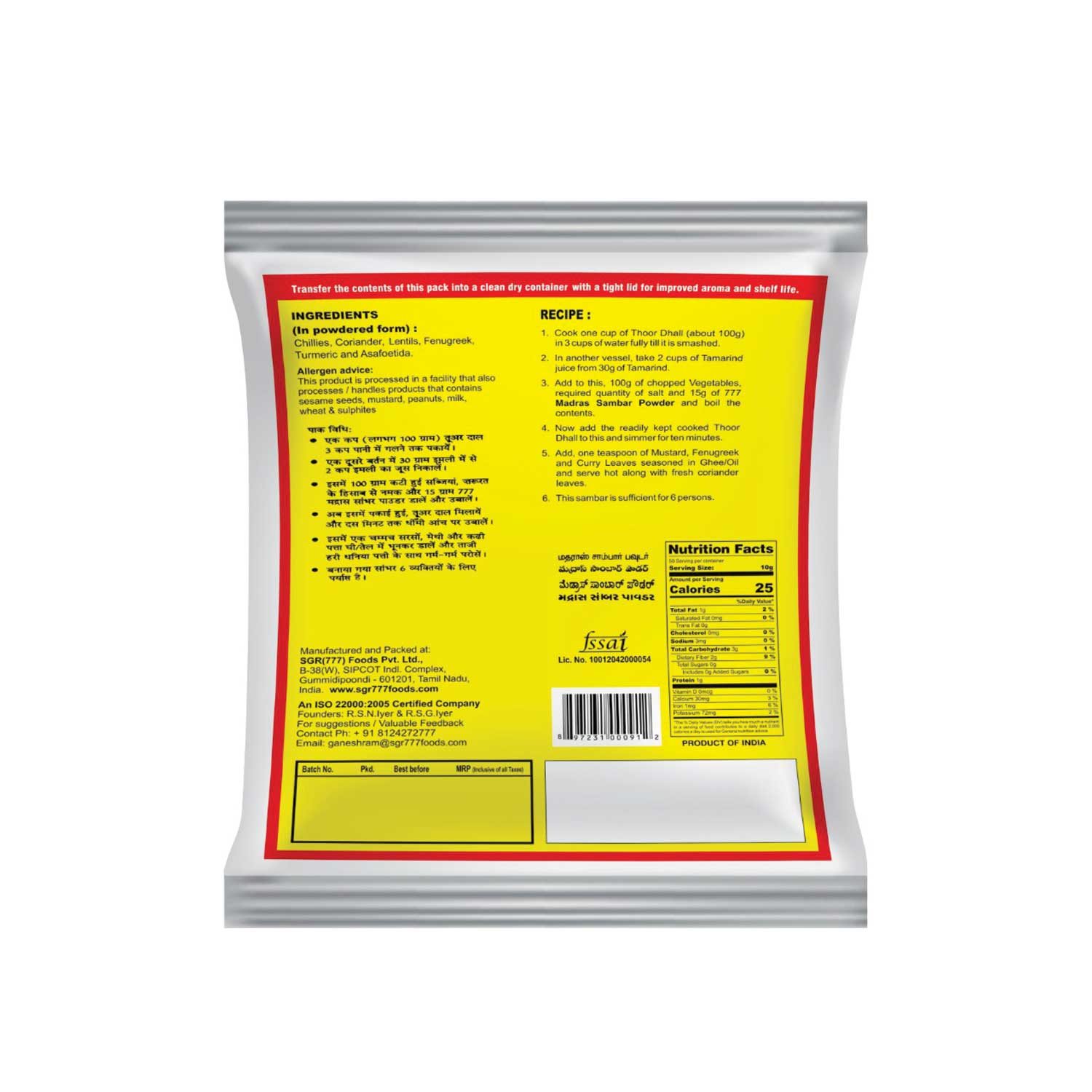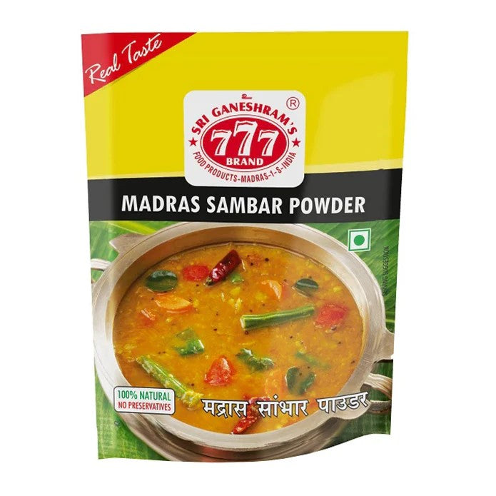 Sambar is a kind of legume or vegetable stew or soup. Sambar often is served over steamed rice and also with idly, dosa, Vada, etc. We at 777 foods, offer the finest and best quality sambar powder, which enables one to make the traditional Madras Madras (now Chennai) style sambar at home.